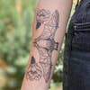 Free-tailed bat and cactus flowers temporary tattoo! Hand-drawn with black lines and stippling. The full design and wingspan measure 6" x 2.5". This design was inspired by the Mexican Free-tailed Bats that live in cave colonies around Texas. Austin is known for the huge plumes of bats that fly out at once from under congress bridge in the evenings, and people travel from all over to witness the spectacle. The bats are an absolutely essential part of our ecosystem, gobbling up many millions of insects (each catch a few thousand per night). Mosquitoes, flies, and moths are not the only snacks they're interested in–bats are also pollinators! There are even some cactus flowers that rely on bats for pollination, which is why this design also features two symmetrical prickly pear cactus flowers that can be cut out or worn as is beneath the bat. Choose 1-Packs or 2-Packs! Lasts 2-5 days • Water-resistant • Comfortable • Skin Safe All original designs by Allison Wilcoxen in Austin