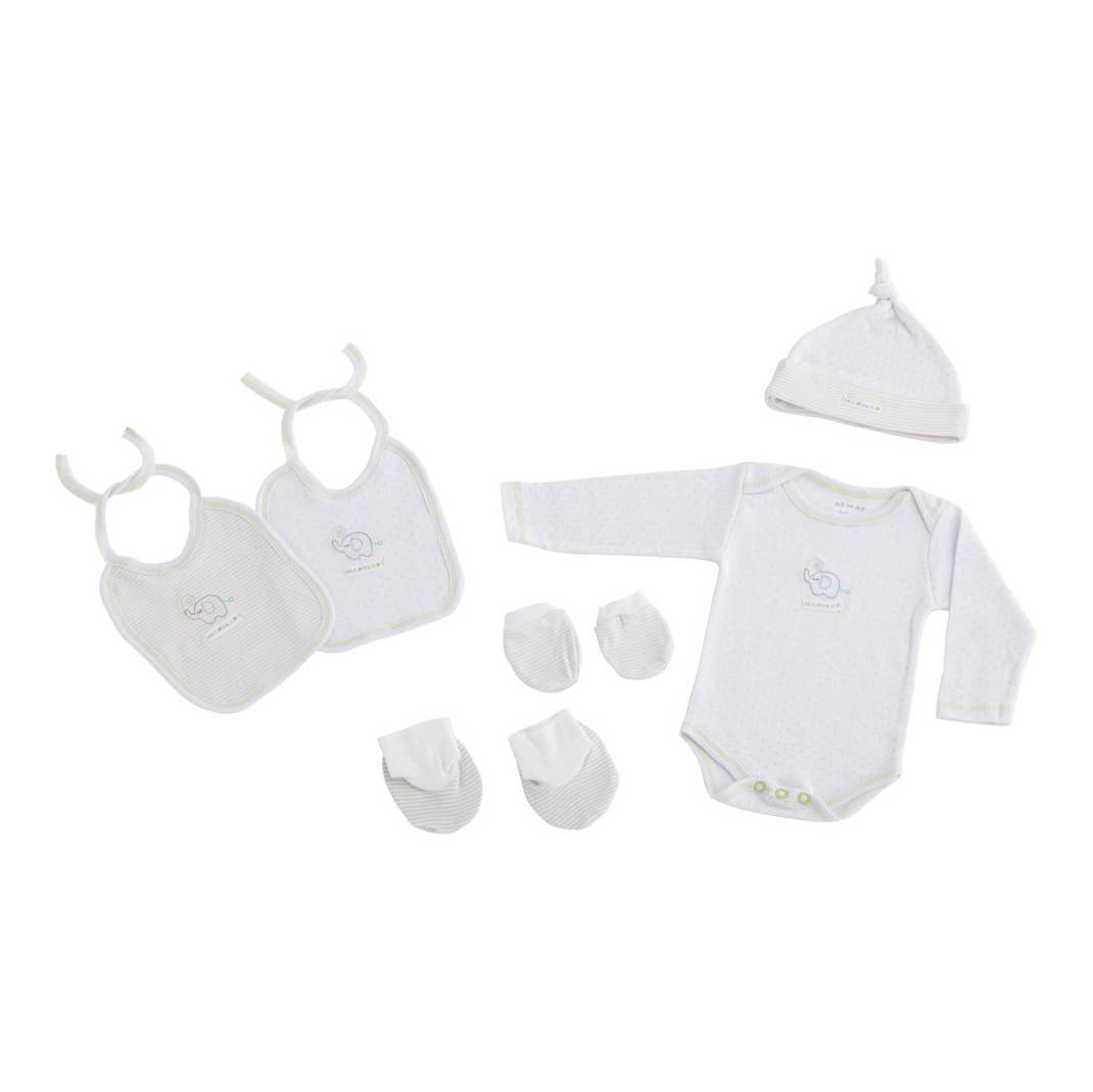 NEWBORN SET 6 PIECES HEART. Product size: 1 MONTH .Packing measures: 26x28x4.5 .Packing weight: 0.188 .Composition 100% COTTON Washing instructions: Washing instructions: to wash on the reverse. Washing machine 40c. Do not use bleach. Tumble dryer in low temperature. Ironing 150°C at maximum temperature. Do not wash in dry. Colour: GREY