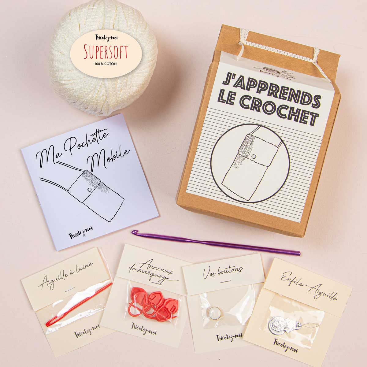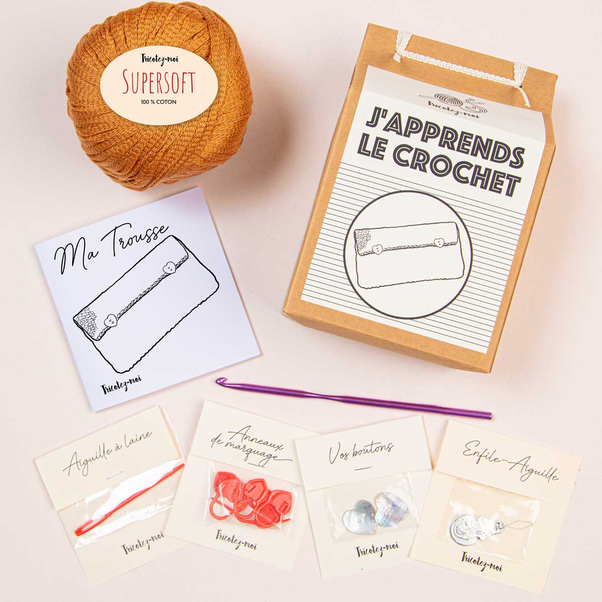 The J'APPRENDS CROCHET knitting box contains everything you need to make a pretty kit, a project for beginners who have never crocheted before. This box allows you to make your first accessory. A box for adults and children from 6 years old. The box contains: 1 ball of pure mercerized cotton, 1 crochet hook no. 4,5, 1 yarn needle, marking rings, 1 needle threader, 2 mother-of-pearl buttons and the pattern with all the step-by-step explanations. Each step of the pattern is illustrated with a QR code, which refers to a video tutorial to help beginners or children learn basic techniques. Once made, the case allows you to store all your necessities (makeup, pencils, cards, etc.). It fits easily into a bag or satchel.