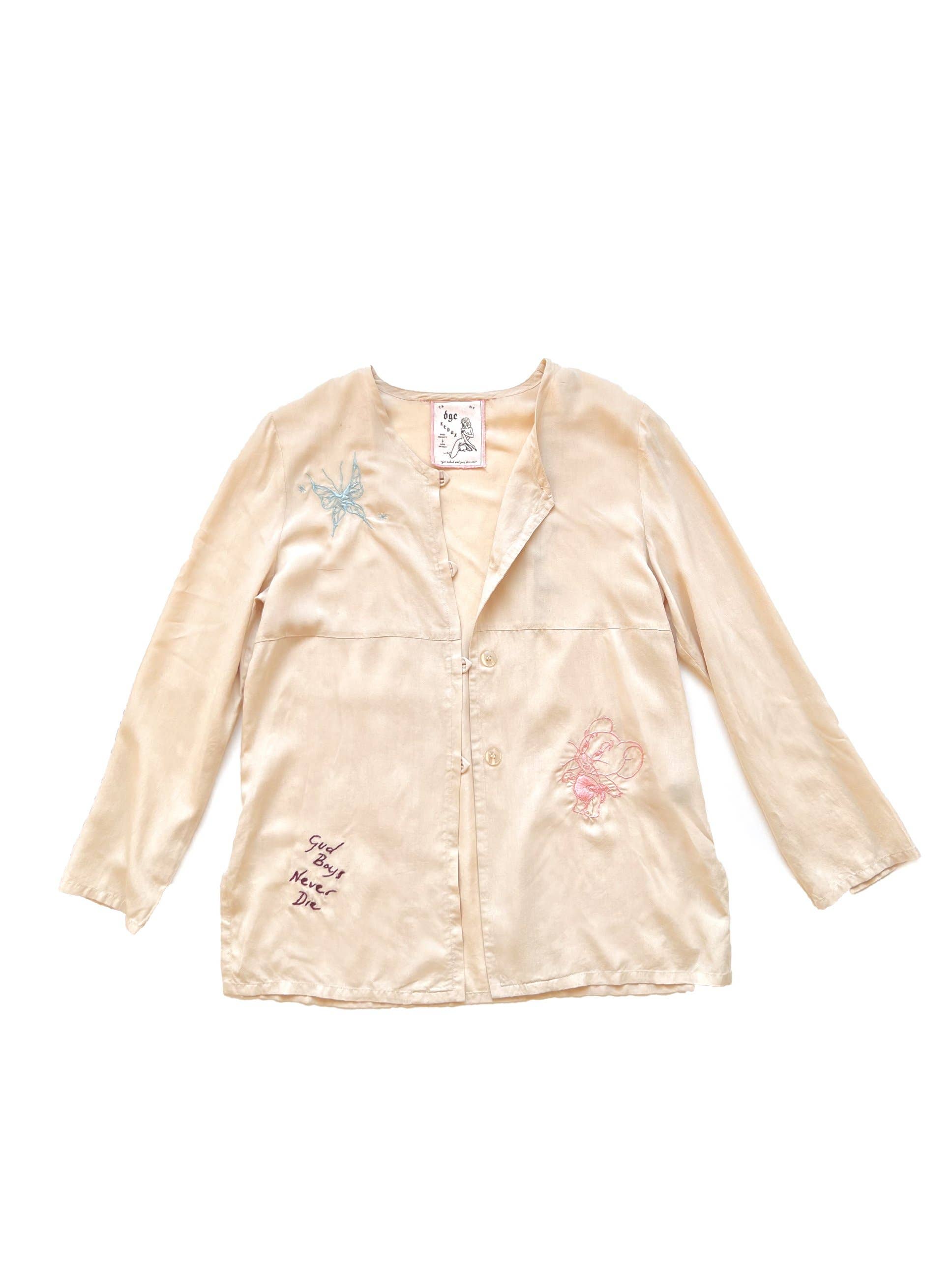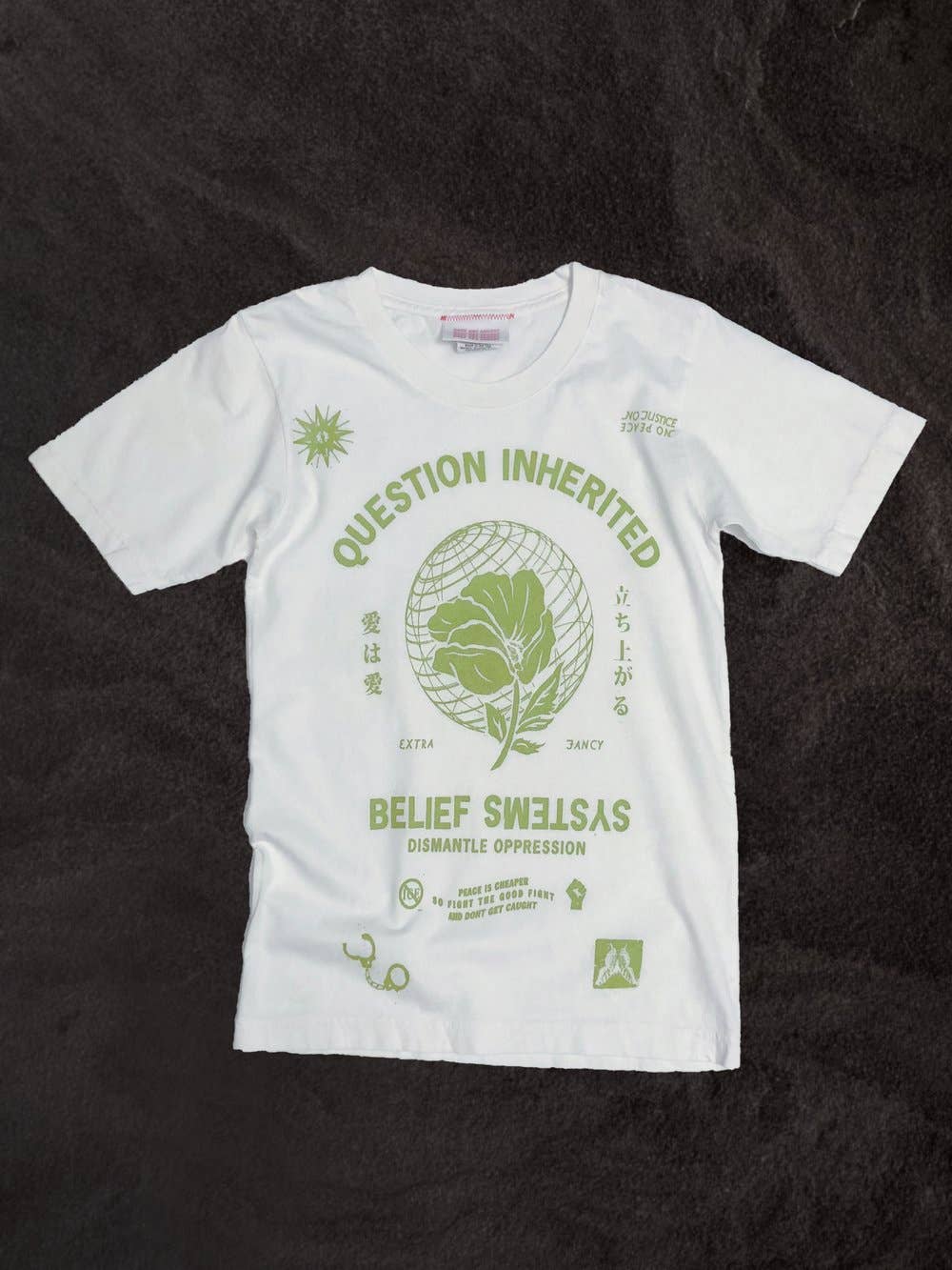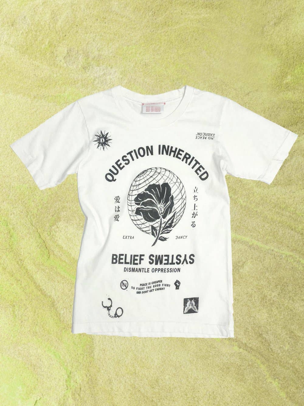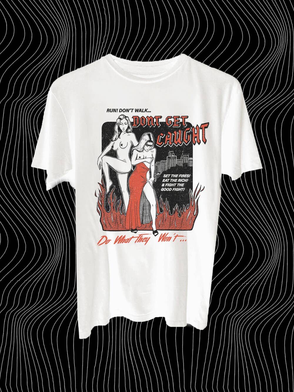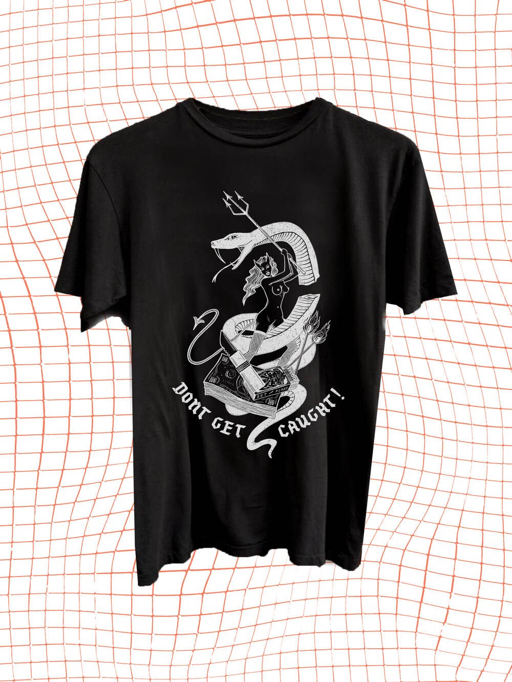 DONT GET CAUGHT fue creada en 2018 por Trixie E, una nativa de California que vive en Nueva York, que cree en crear prendas versátiles y confeccionadas de forma ética que empoderen a la persona que usa DGC. Con más de una década trabajando en la industria de la moda, Trixie E. no sabía que su pasión por esta industria contribuía a la explotación de los trabajadores de la confección, así como a la explotación de nuestro planeta y sus recursos. DONT GET CAUGHT combina el proceso de diseño, el arte y sus valores para crear prendas que sean sostenibles, éticas y vanguardistas. Trixie hace todos los gráficos ella misma y le encanta hacer referencia y recuperar imágenes antiguas de mujeres creadas para la mirada masculina dibujando desde la perspectiva femenina. Para su arte, hace referencia a anuncios antiguos de escorts, pósters de películas para adultos y a Tokyo Lucky Hole, del fotógrafo Araki. Se inspira en la cultura y las artes japonesas basadas en la reparación, como el kintsugi y el shashiko, así como en otras culturas asiáticas, incluida su propia herencia filipina. Tiene una afinidad por la decadencia exagerada de finales de los 80 y principios de los 90, provocada por ver los rituales y rutinas al estilo de su madre mientras crecía.