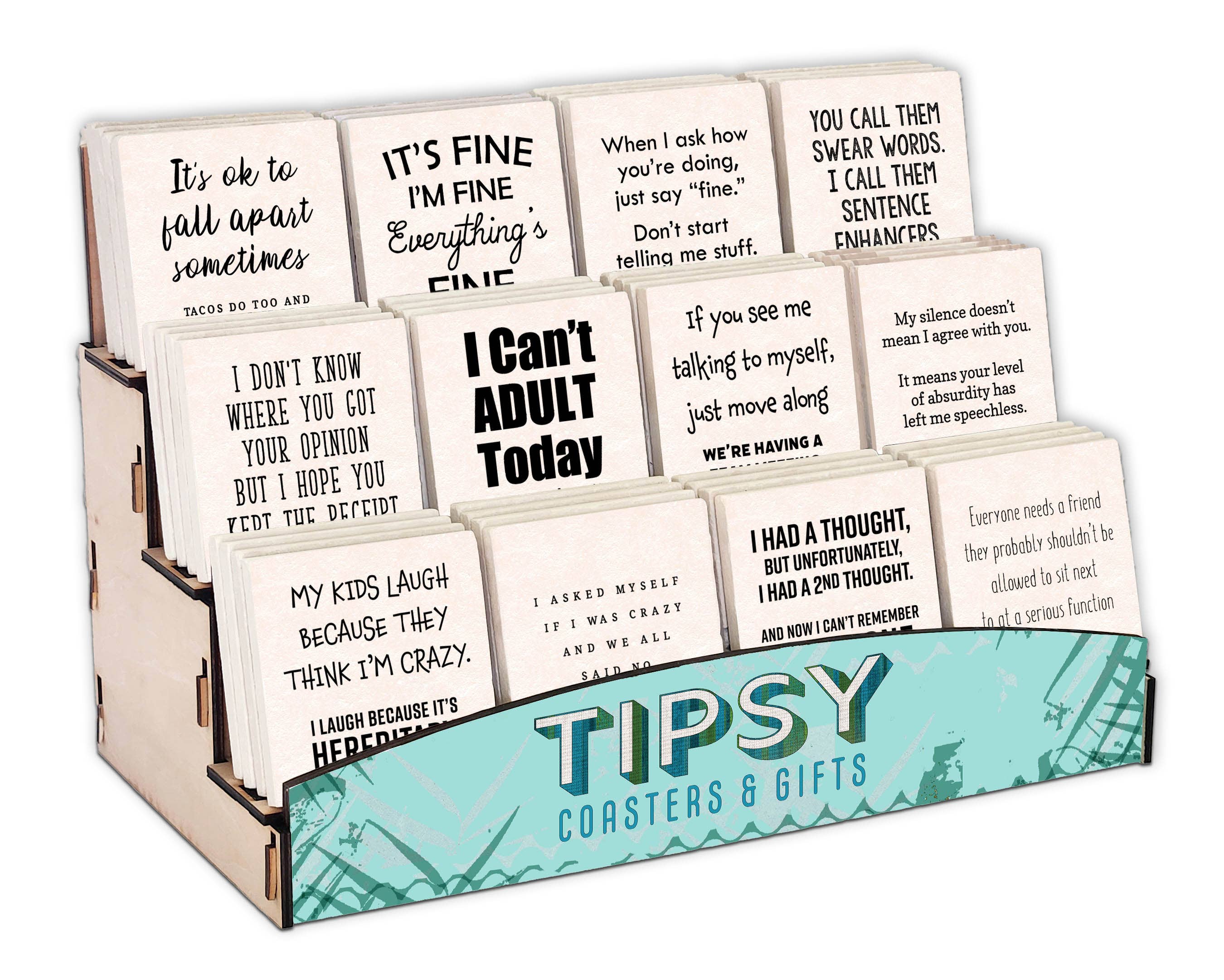 AVISO: Tipsy Coasters permanecerá cerrado a partir del martes 8 de octubre debido al huracán Milton. Los plazos de entrega se ampliarán. Esperamos volver a abrir rápidamente y enviar los pedidos antes. ¡Gracias por tu paciencia! ¡Desde 2013, Tipsy Coasters lleva risas y sonrisas a mesas, bares y mostradores de costa a costa! Sus humildes comienzos se remontan al garaje de Steven Kalter, donde comenzó a fabricar regalos y productos para el hogar para minoristas locales en 2008. Asistió a su primera feria comercial nacional en Atlanta y al instante se enganchó al ambiente creativo, regresando año tras año. El esfuerzo continuo por conseguir el siguiente producto exitoso impulsó el desarrollo hasta que, por fin, ¡los Tipsy Coasters cobraron vida! Pensando en la calidad y en los clientes, Tipsy Coasters cuenta con gráficos nítidos y frases graciosas en baldosas de piedra caliza natural superabsorbentes que añaden estilo a su funcionalidad. Todo está hecho internamente, desde el diseño hasta el producto final. Es un placer escuchar a los compradores decir que sus tiendas se llenan de risas todos los días cuando los clientes leen posavasos. Aunque Tipsy Coasters sigue ampliando sus horizontes, mantiene la calidad única y artesanal que encarna la pasión creativa de su equipo. La oferta de productos también incluye posavasos e imanes para automóviles, ¡y hay más en camino!