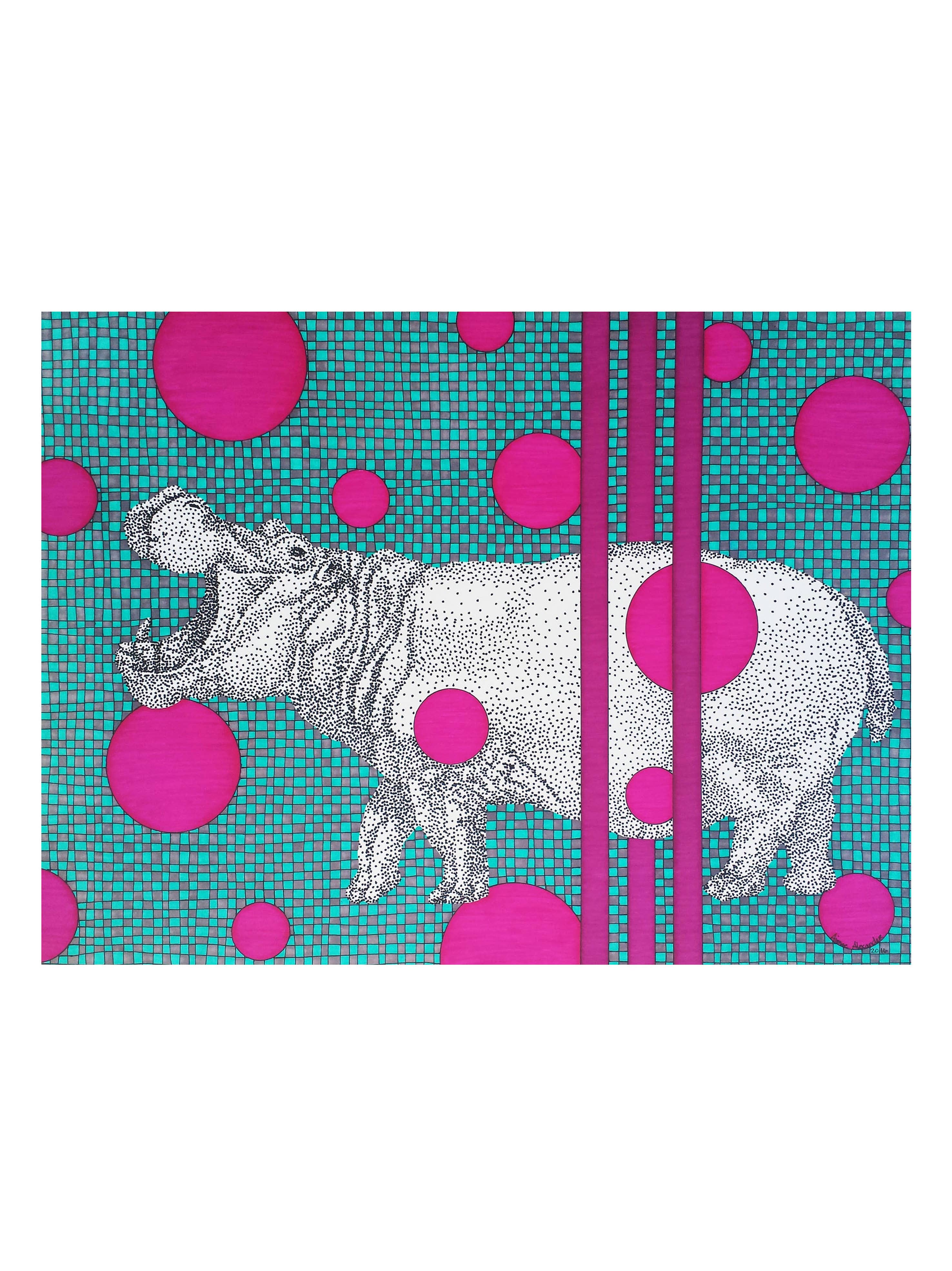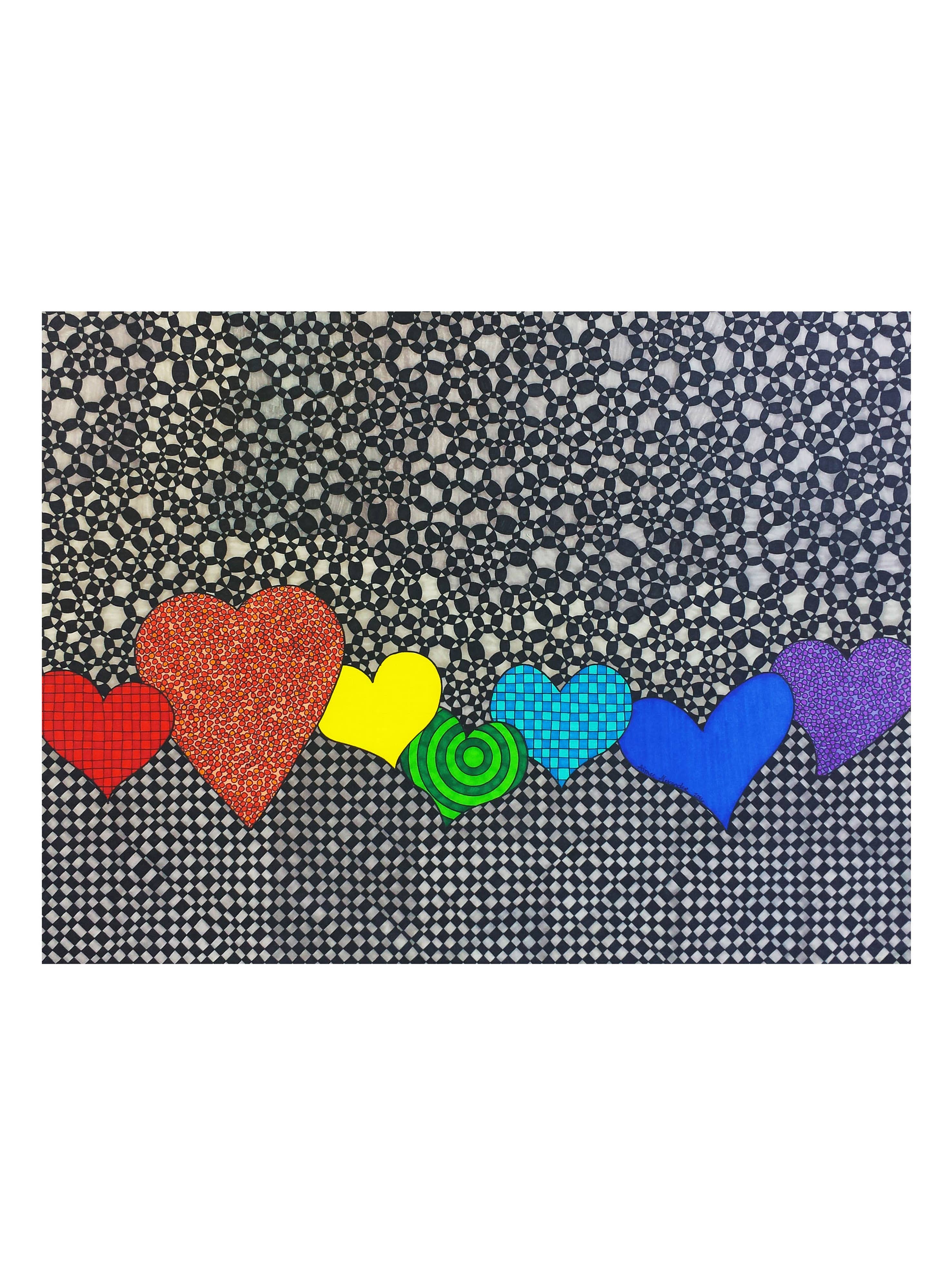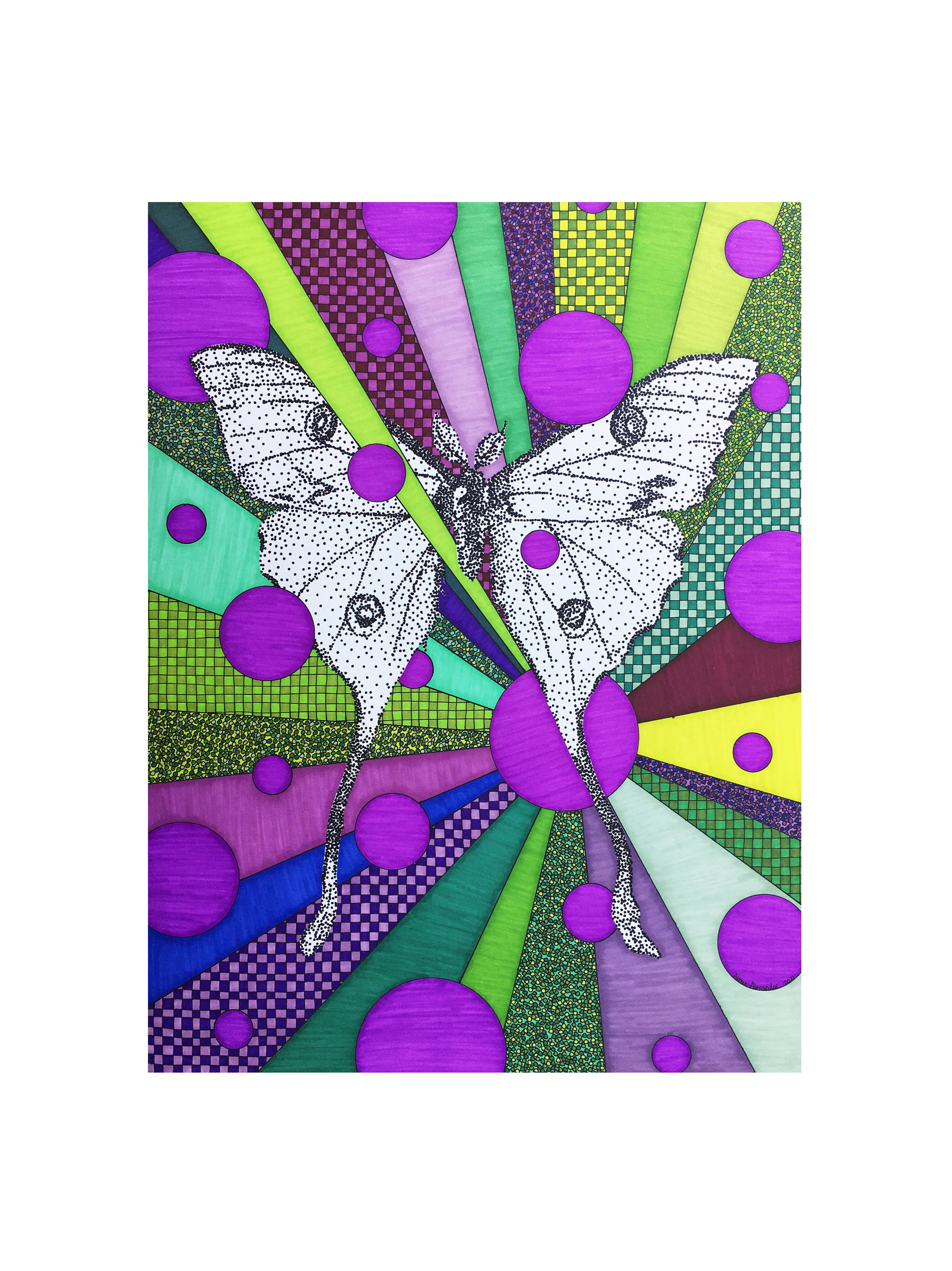 A los 3 meses de edad Aimee trazó el patrón de la camisa de su abuela con su diminuto dedo. A los 12 años descubrió el mágico mundo del arte y el diseño en un viaje a San Francisco para ver a un amigo graduarse de la escuela de diseño. Fue entonces cuando decidió que se iba a mudar al Área de la Bahía de San Francisco y convertirse en artista cuando creciera. Después de graduarse Sacramento State con una licenciatura en Arte de Estudio, empacó sus maletas y se mudó a la bahía. Todos los diseños de Aimee se crean con una regla, una plantilla de círculo, una regla y un número insano de puntos. Cada pieza es una explosión de color, felicidad y maravilla.
