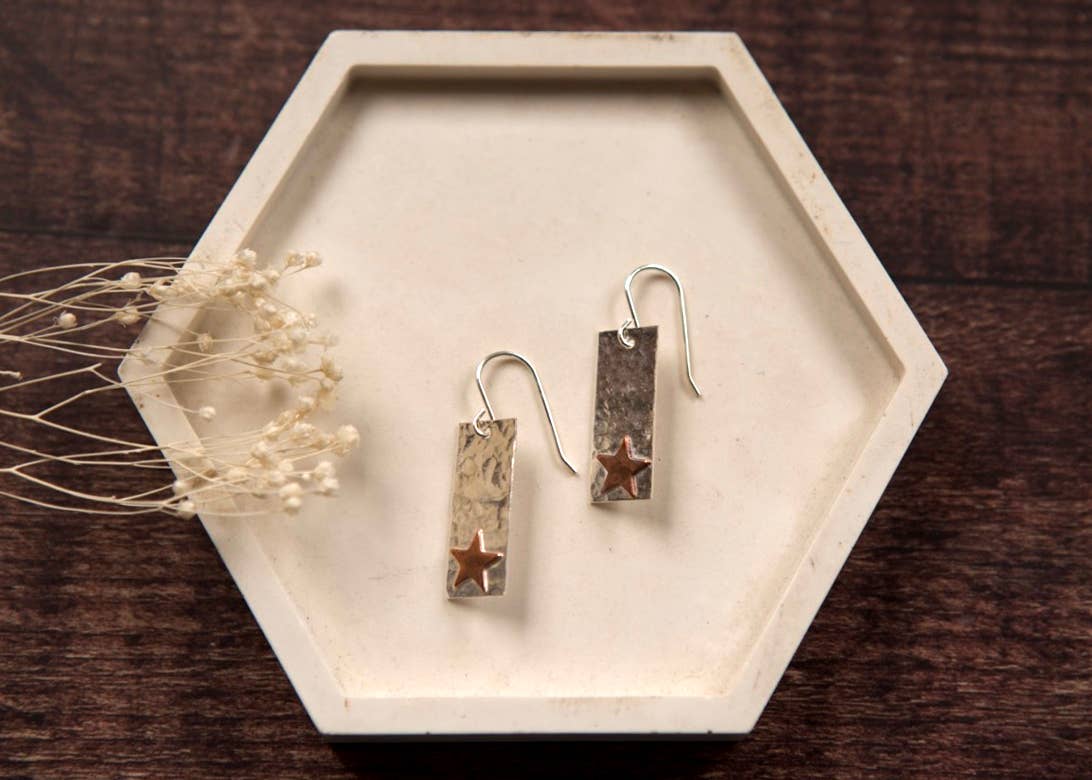 El negocio fue creado por Victoria en 2012 a partir de su mesa de cocina en la antigua granja con vistas al paisaje rústico de Cornualles. Avance rápidamente unos años, y The Old Farmhouse Jewellery es ahora un pequeño equipo ubicado en la ciudad costera de Penzance, Cornualles, a pocos minutos del icónico Monte St Michaels. Las piezas están texturadas a mano y soldadas juntas para crear joyas hermosas y fáciles de llevar, abastecidas por tiendas y boutiques de todo el mundo. Nuestras joyas son de plata de ley (sin níquel), con salpicaduras añadidas de color con formas de latón texturizado, acentos de cobre, cuentas y piedras semipreciosas, y cuentas de cristal checo. «Empecé este negocio porque quería crear joyas cotidianas asequibles para todos. Me gusta el proceso creativo de esbozar diseños y convertirlos en una joya que la gente atesora».