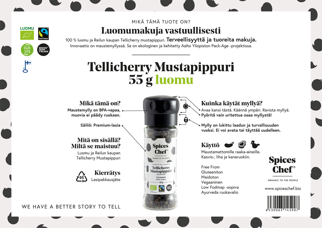 Spices Chef es una empresa de alimentos orgánicos y una marca comercial. Trabajamos desde una pequeña fábrica en Kontiolahti. Spices Chef se creó en 2014 con la visión de que había una mejor manera de hacer negocios. Desde el principio, nos esforzamos por construir Spices Chef como una marca de sustentabilidad. La conclusión de nuestro negocio son nuestros valores. Creemos que, como empresa, Spices Chef tiene la responsabilidad de practicar la conciencia ambiental en sus operaciones diarias. Somos conscientes de que nuestras decisiones tienen el poder de contribuir a cambios socioeconómicos positivos en los medios de vida de los agricultores y productores. Estamos comprometidos a poner a disposición de nuestros clientes la elección de productos de sostenibilidad y, lo que es más importante, están empaquetados de manera segura, fáciles de usar y asequibles. Nos complace anunciar que la principal solución de empaque que utiliza Spices Chef son los recipientes bioplásticos hechos de sustancias renovables de caña de azúcar. Nuestro equipo de diseñadores ha dado vida a estos contenedores bioplásticos negros con sus trazos creativos. ¡Creemos que nuestros productos serán una delicia en tu cocina! ¡Le damos una calurosa bienvenida para que pruebe los productos de Spices Chef! Cada uno de nuestros productos tiene una historia mejor que contar.