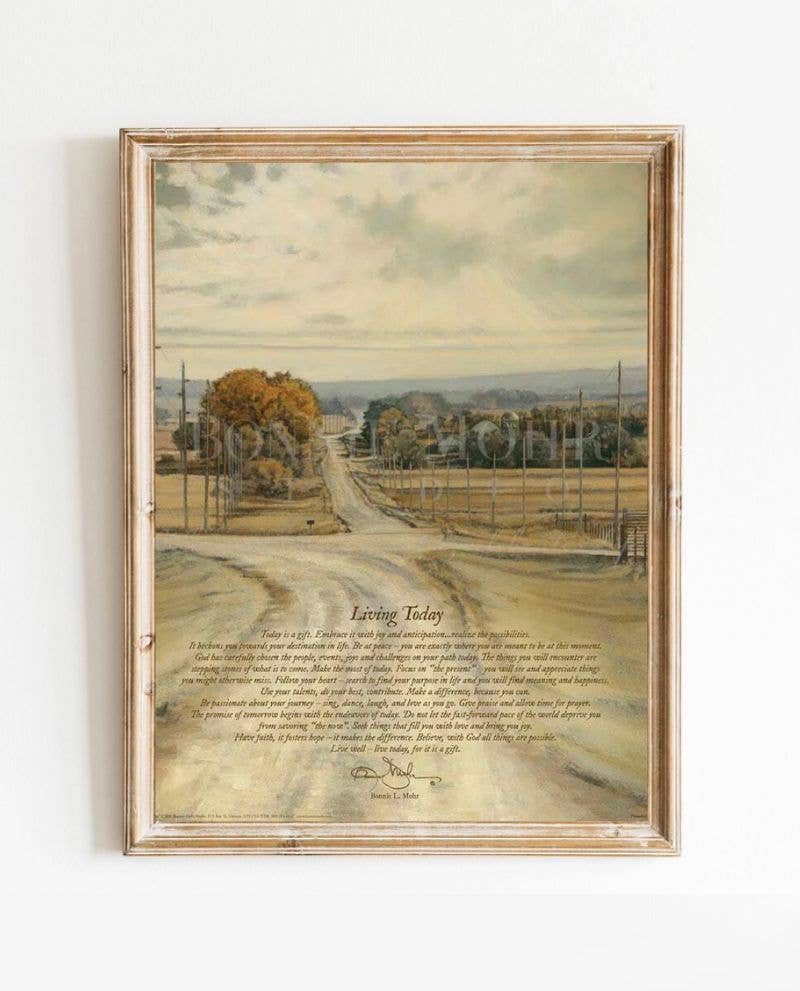Hola, soy Bonnie... la mujer detrás del caballete con un pincel en la mano. También soy la esposa de un productor lechero, madre de 5 hijos y abuela de 5. Me encanta madrugar, el café recién hecho, el vino tinto dulce, todo lo relacionado con la calabaza, la vida en la granja, ganar una buena partida de Pfeffer, ¡y me apasiona mi trabajo! Creé Bonnie Mohr Studio en 1985 y estoy muy feliz de que me hayas encontrado a mí y a mi pequeño sitio en Internet. Si alguien me hubiera dicho que algún día me convertiría en artista, ¡probablemente me habría reído! Convertirme en artista no estaba en el radar para mí, ni era algo en lo que me propusiera convertirme. Sin embargo, mirando hacia atrás, me ENCANTABA el arte y me fascinaban el color, el diseño y las pinturas cuando era niña. No me preguntes por qué, pero ansiaba aprender más y me atraía el mundo del arte y el impacto que sentía que podía tener. Mi trayectoria artística de más de 35 años ha estado repleta de oportunidades, pruebas, sorpresas y aventuras.