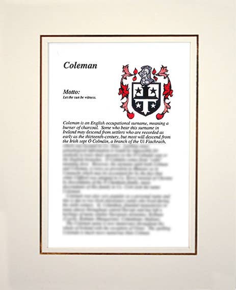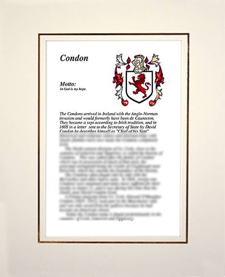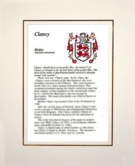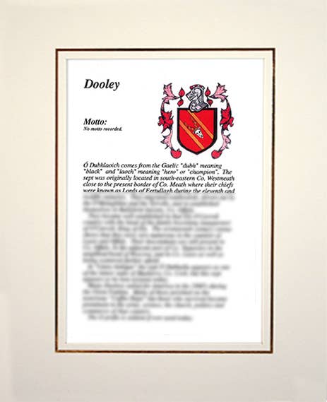 Bienvenido a Apellidos familiares irlandeses, hogar de la selección más completa de escudos e historias familiares. Las historias familiares vienen en dos tamaños, estándar y grande, y las combinaciones de escudo e historia vienen montadas en negro clásico o crema, solo tiene que añadir su propio marco. FRANQUEO GRATUITO DISPONIBLE EN TODO EL MUNDO
