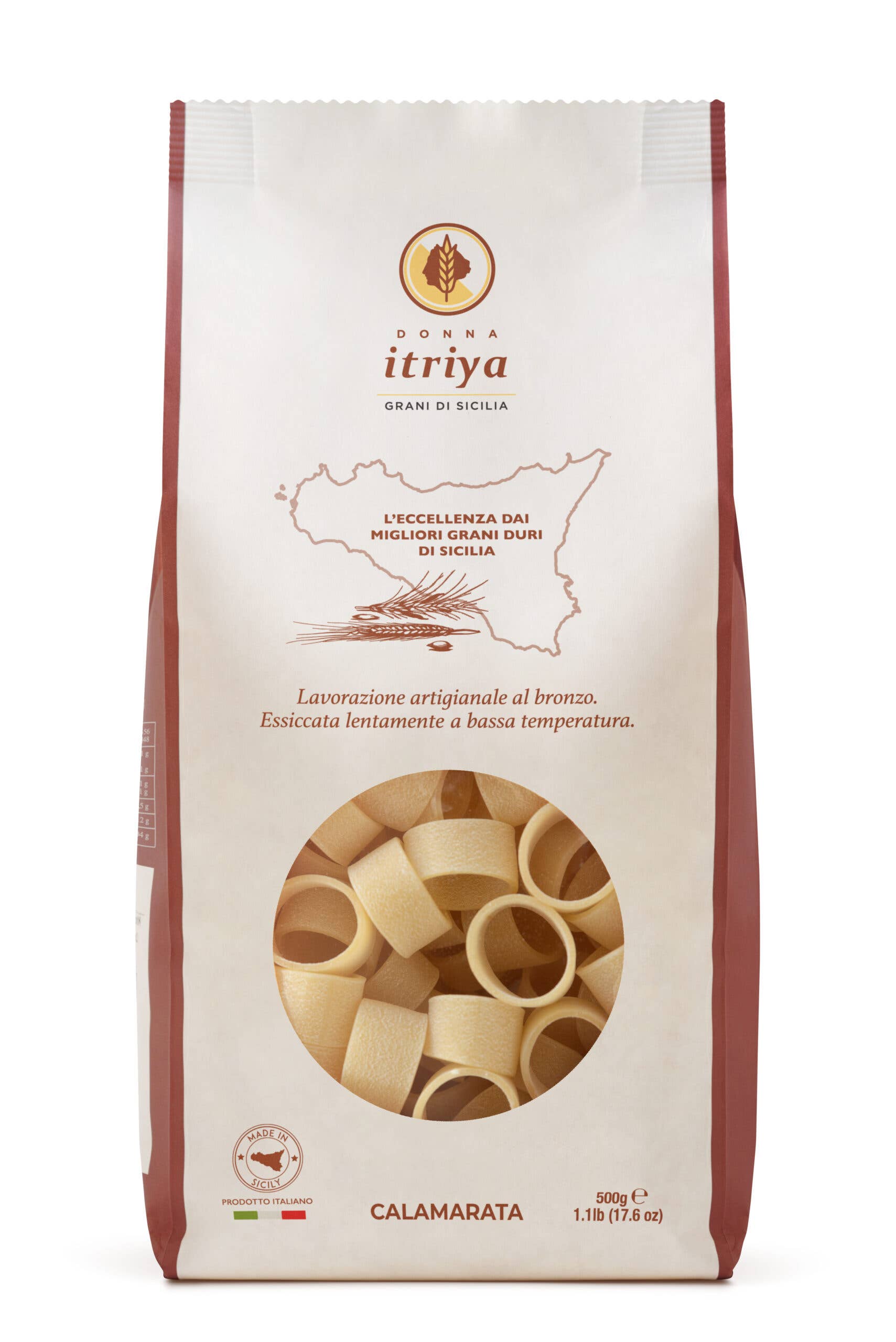 Nuestra pasta nace de una cadena corta, controlada y trazada enteramente dentro de los confines de Sicilia, manteniendo un estrecho vínculo con nuestra tierra y con la tradición local originaria. Solo sémolas de los mejores trigos de Sicilia y de las variedades de trigos antiguos de Sicilia son cuidadosamente seleccionadas para crear una pasta de calidad superior, convirtiéndose en una excelencia gastronómica. Elegir Donna Itriya significa disfrutar de una pasta que lleva consigo la historia de nuestro territorio y de los orígenes de la pasta seca en el mundo, concediéndose el placer de un sabor auténtico e inconfundible. Lenta desecación a bajísima temperatura y una planta de producción de última generación son los elementos distintivos de Donna Itriya.