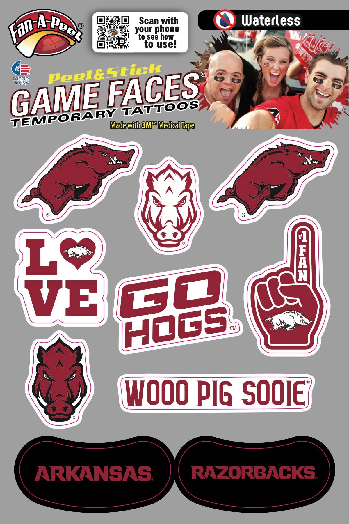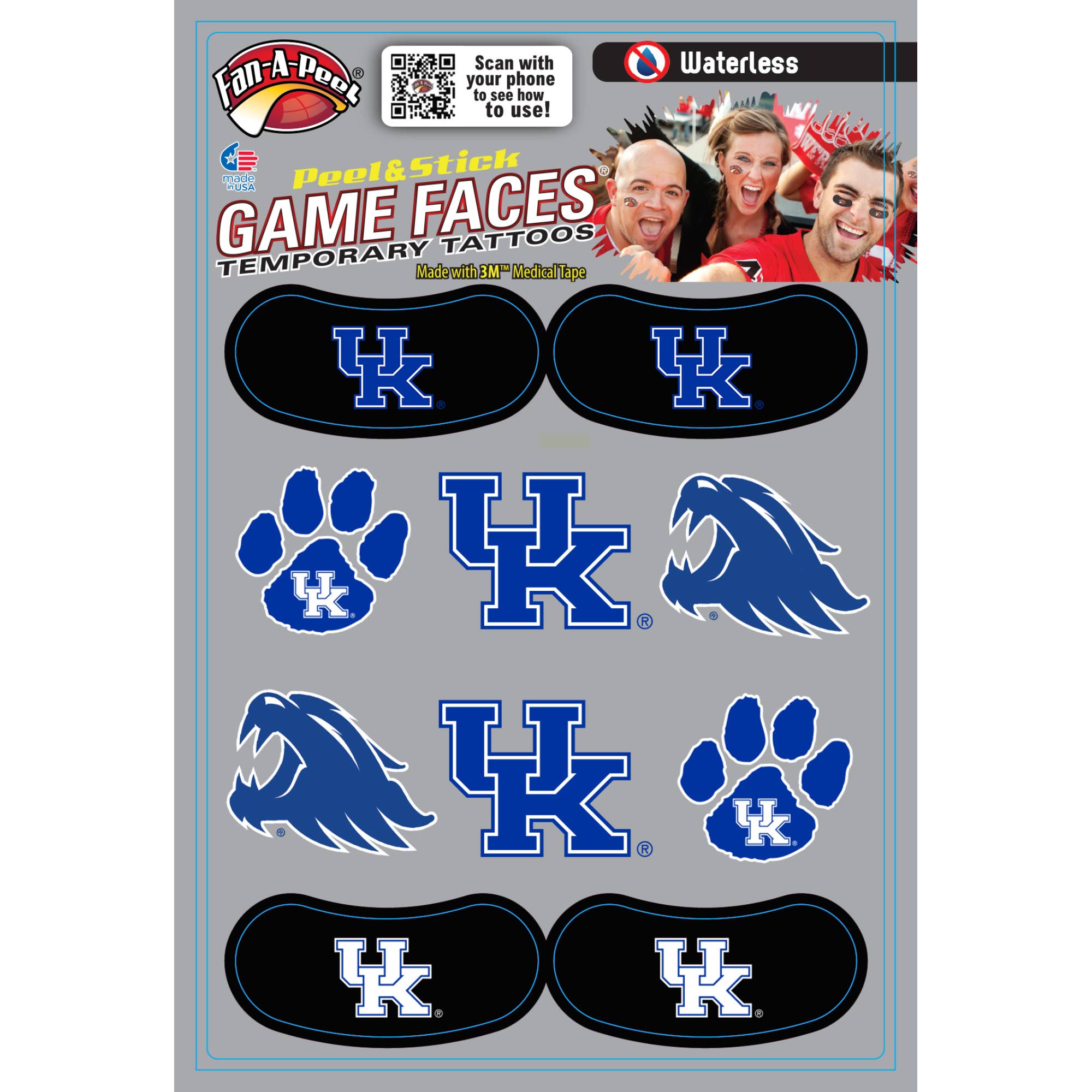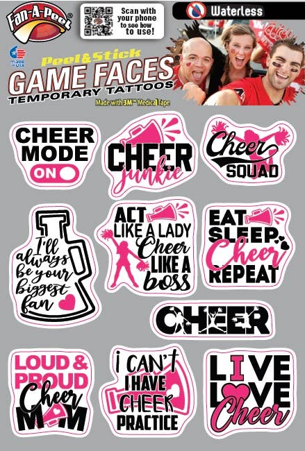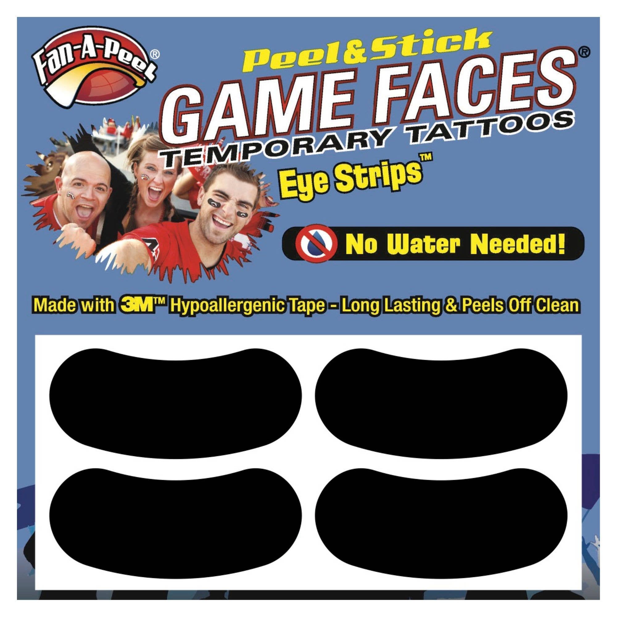 Fan-A-Peel/Gamefaces han sido durante mucho tiempo un elemento básico en el mundo deportivo. Introducido por primera vez hace más de 25 años como un tatuaje aplicado al agua en los deportes colegiados ahora se ha convertido en una declaración de moda para aficionados, animadoras y jugadores. Nuestros productos han adoptado las tendencias de la moda, así como el impulso de compra y uso inmediato introduciendo hace varios años un tatuaje que se puede utilizar sin agua y se utiliza en casi cualquier superficie. Como inventor y titular de patentes para los tatuajes temporales Peel & Stick, hemos revolucionado el mercado y facilitado a cualquiera usar y quitar su «GameFace» a voluntad. Utilizamos los adhesivos 3M Medical más seguros en nuestros productos y hemos ampliado nuestras líneas para incluir metal y purpurina. Un día de juego no pasa sin ver nuestros productos en la televisión, en la impresión y en las gradas. Además de nuestro mantra para la seguridad y la conveniencia, hemos adoptado la sostenibilidad mediante el uso de materiales reciclados en nuestros envases. Todo lo que queremos es que te diviertas y «pongas tu juego en»!!