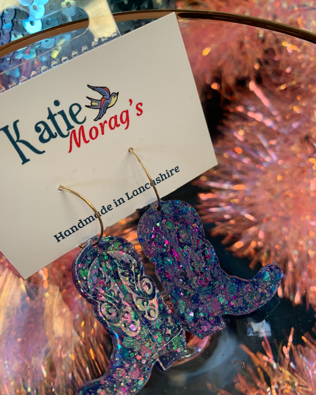 Soy Katie, la propietaria y creadora de Katie Morags. Como la mayoría de las ideas descabelladas, Katie Morags nació durante el confinamiento: los pubs estaban cerrados y ¿qué podíamos hacer sino gastar todo nuestro tiempo y dinero en manualidades? Lo que empezó como una forma de ocupar el tiempo pronto creció hasta convertirse en algo mucho más grande: ocupando no solo tiempo, sino también gran parte de la casa. Con sede en Clitheroe, Lancashire, Katie Morags crea joyería y accesorios hechos a mano y con personalidad utilizando resina y arcilla polimérica. Cada pieza se fabrica en pequeñas series, a menudo completamente única, debido a la escala y la naturaleza artesanal del proceso. El estilo es descaradamente expresivo: inspirado por iconos como Pat Butcher, famosa por sus inolvidables pendientes llamativos, y por la creatividad intrépida de David Bowie. El color, la actitud y la individualidad están en el corazón de cada diseño. No hay dos piezas exactamente iguales — porque las personas que las llevan tampoco lo son. Si hubiera un símbolo que capturase el espíritu de Katie Morags sería el rayo ⚡: audaz, enérgico, un poco rebelde e imposible de ignorar. La joyería de Katie Morags está hecha para personas que aman las piezas llamativas, la individualidad y un toque de glamour con actitud.