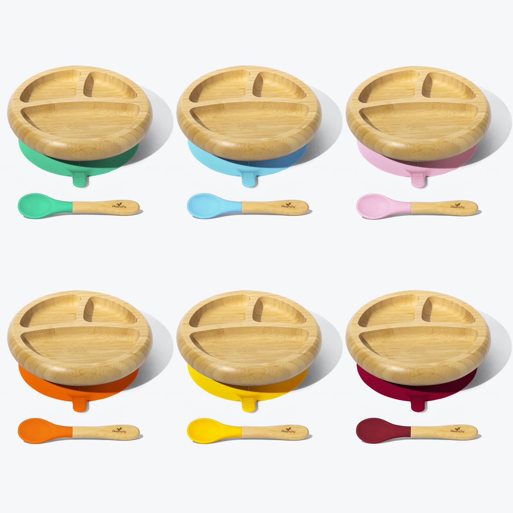 VAJILLA DE BEBÉ SOSTENIBLE «Nuestros hermosos y prácticos platos para bebés son no tóxicos, respetuosos con la tierra, sin BPA, BPS, PVC, plomo y ftalatos. Hecho por padres para padres que se comprometen a reducir el desperdicio y apoyar la sostenibilidad. La fuerte base de succión de silicona extraíble se adapta a la mayoría de bandejas de tronas y mesas, y los cuencos y platos se pueden utilizar sin ellos durante muchos años por venir por niños pequeños, niños y padres, en casa o en movimiento. Gracias por ayudar a nuestro planeta». ~El Equipo Avanchy