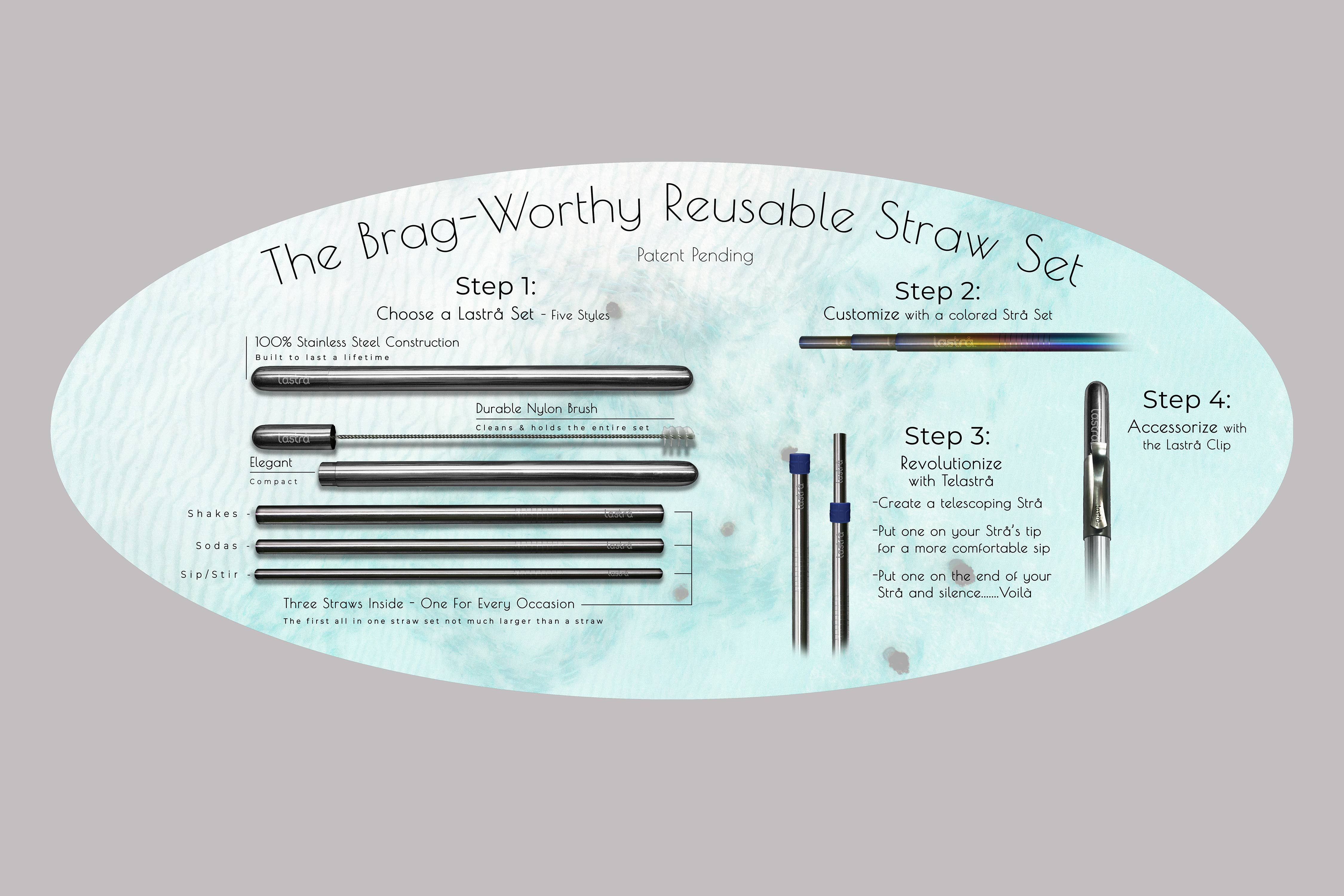 El Lastrå Set es el primer juego de paja reutilizable que no es mucho más grande que una sola paja. Construido de acero inoxidable 18/8 de grado alimenticio, estos juegos están diseñados para durar toda la vida. Cada juego es fácil de usar y fácil de limpiar. A diferencia de muchos otros juegos de pajitas en el mercado hoy en día, todos los componentes de la línea de productos Lastrå son aptos para lavavajillas. Esto incluye el estuche de transporte. Cada juego viene estándar con tres pajitas de acero inoxidable anidadas dentro de una carcasa de acero inoxidable. Hay un cepillo de limpieza integrado en la tapa que mantiene las tres pajitas juntas, evitando que se caigan cuando se abre el juego.