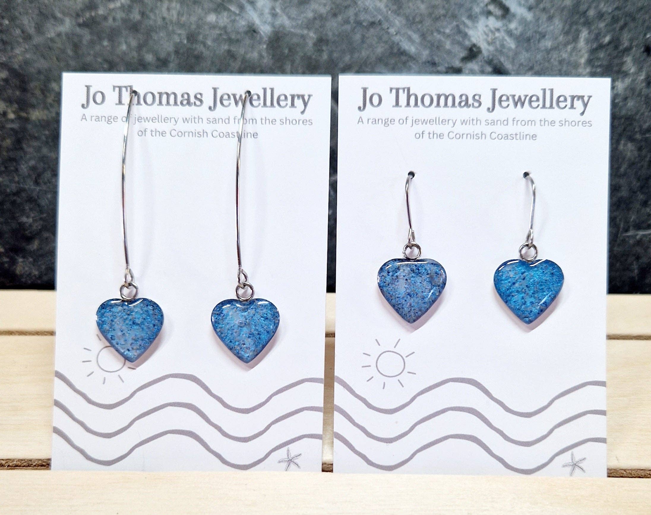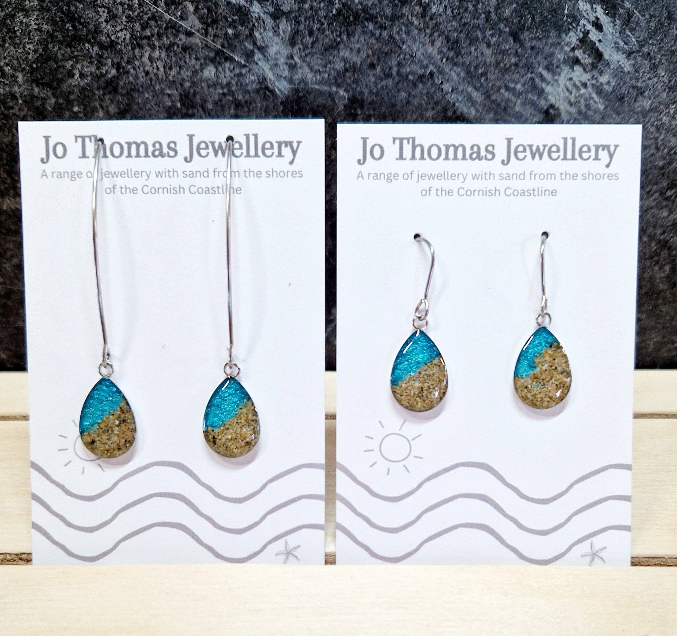 Me llamo Jo Thomas. Trabajando desde mi estudio en Falmouth, Cornwall, diseño y hago hermosas joyas contemporáneas de resina utilizando una variedad de engastes de acero inoxidable en forma de cabujón, trabajando con arena de la costa de Cornualles, añadiendo colores y me encanta crear esta gama única de joyas que se inspira en gran medida en los fabulosos paisajes de Cornualles que me rodean en la costa y en el campo. Hay muchos temas en mis colecciones, si hay un diseño o artículo específico Si quieres que lo añada, ponte en contacto con nosotros. Si tienes una tienda cerca de la playa y quieres tener tu propia colección de recuerdos con tu propio logotipo en tus tarjetas de presentación, ponte en contacto conmigo.