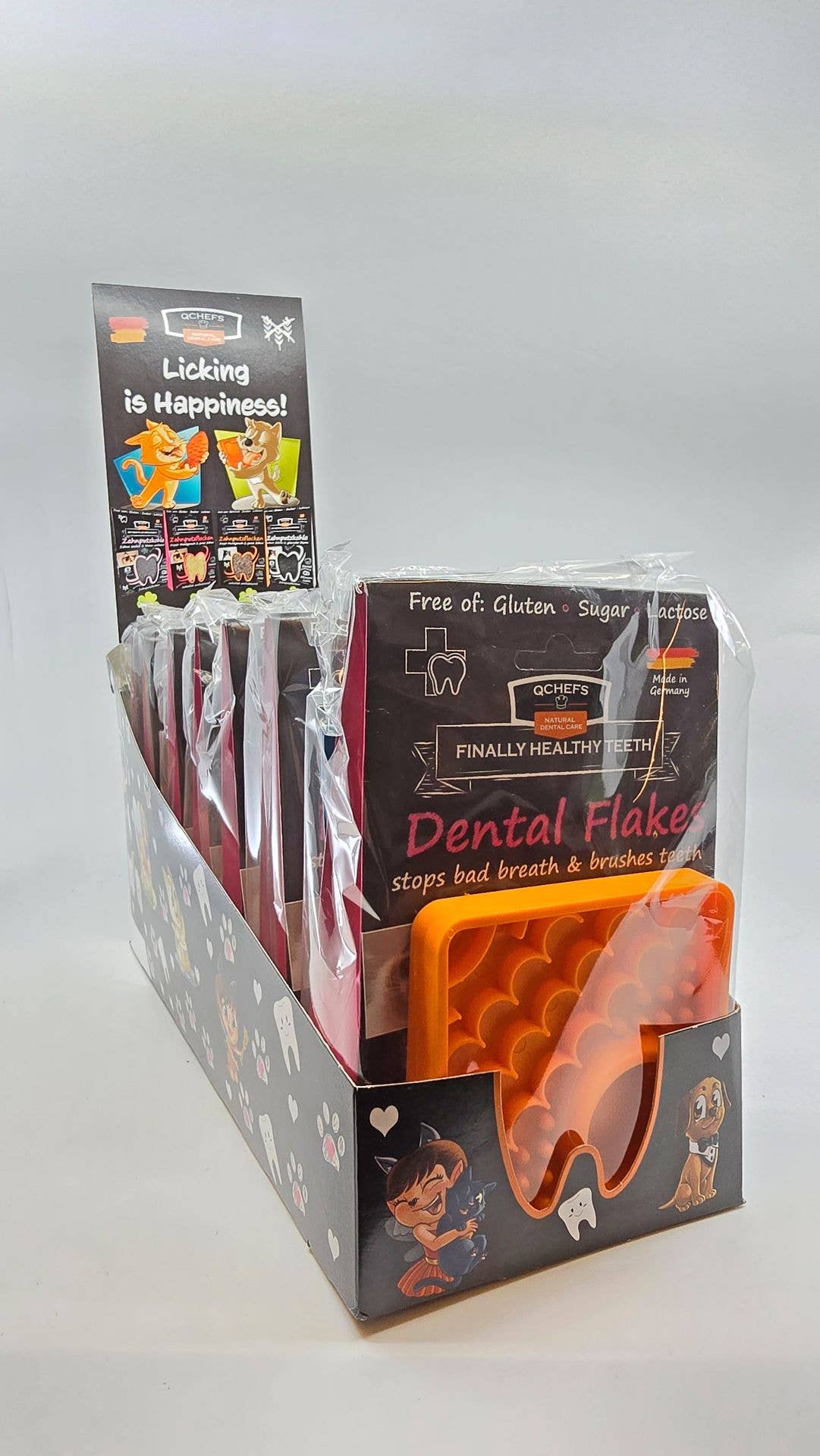 QCHEFS Cuidado dental natural — ¡desarrollado por un microbiólogo! Mal aliento, sarro y gingivitis: alrededor del 80% de todos los perros y gatos tienen problemas dentales. ¡Se tenía que encontrar una solución científicamente sólida! QCHEFS se desarrolló utilizando hallazgos de la microbiología oral. A diferencia de la mayoría de los productos en el mercado, QCHEFS no se basa en la limpieza mecánica de los dientes, sino en el efecto antibacteriano natural de los péptidos en el requesón. Gracias a este ingrediente activo, el cuidado dental de QCHEFS funciona eficazmente contra las bacterias de la placa en la boca, la causa raíz de los problemas dentales. Lo especial de esto: los productos QCHEFS solo consisten en ingredientes naturales: requesón, alforfón (sin grano), algarrobo, arroz, glicerina vegetal de aceite de coco, aceite de colza y aceite de coco, y eso es todo. Todos los productos son vegetarianos, libres de lactosa, gluten, azúcar y aditivos. Por lo tanto, también son adecuados para animales que sufren de alergias o enfermedades. Los productos QCHEFS se producen internamente en la empresa familiar en Baviera, Alemania.