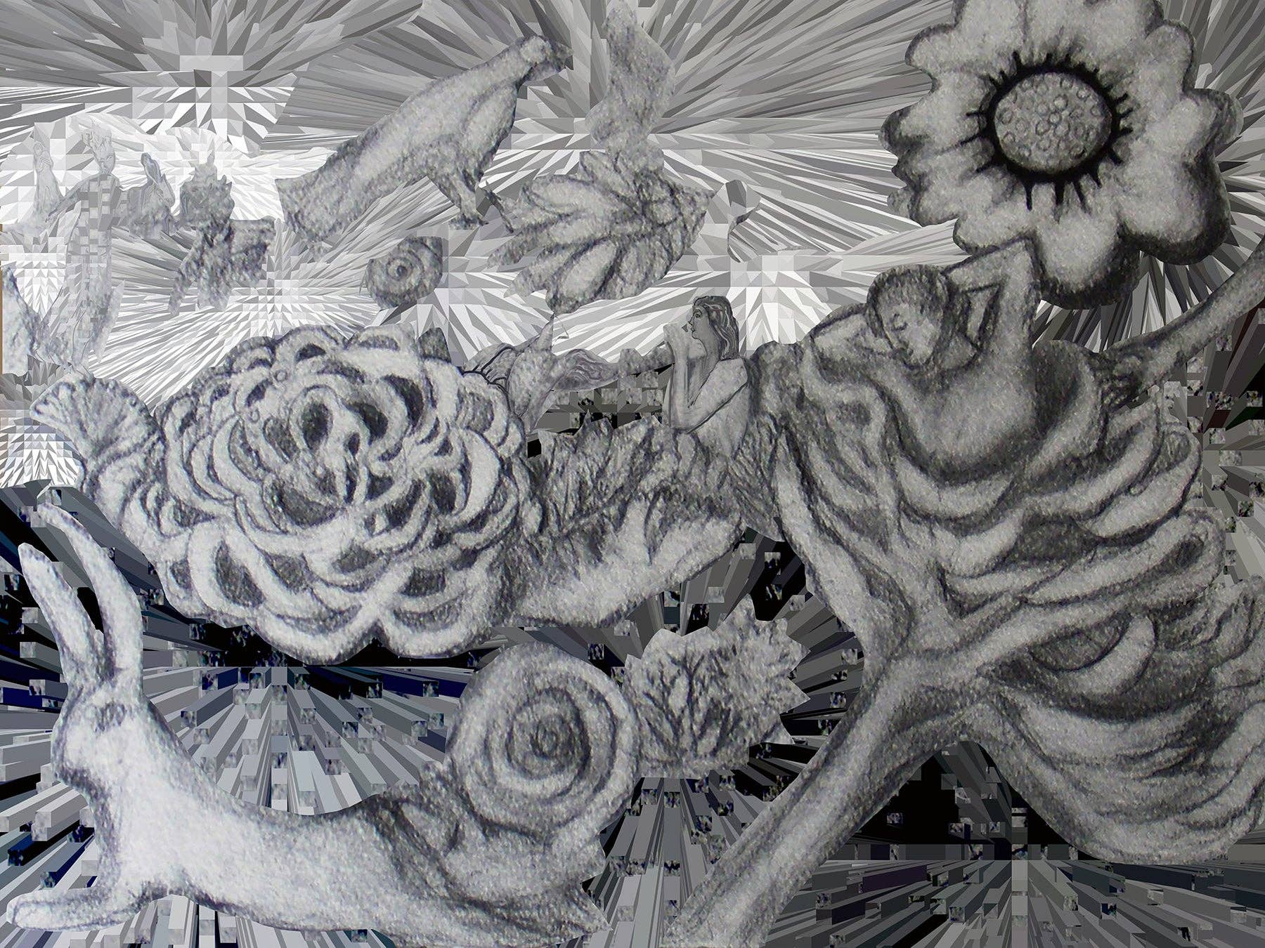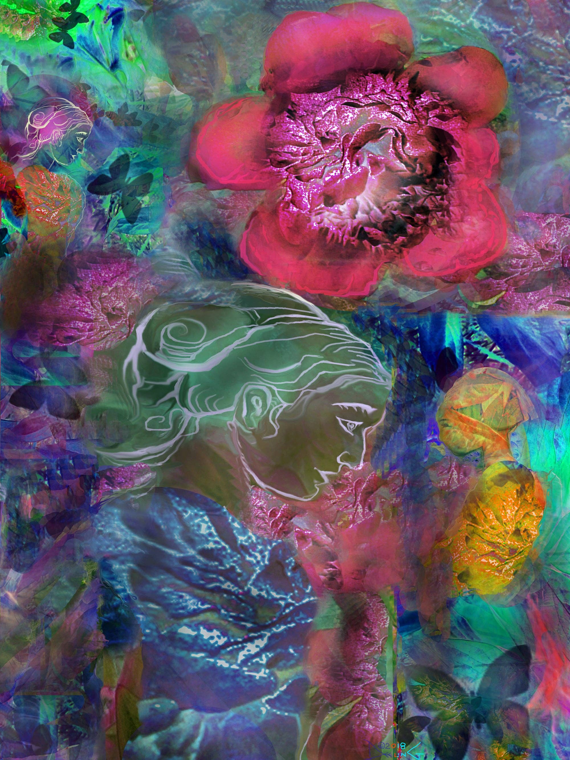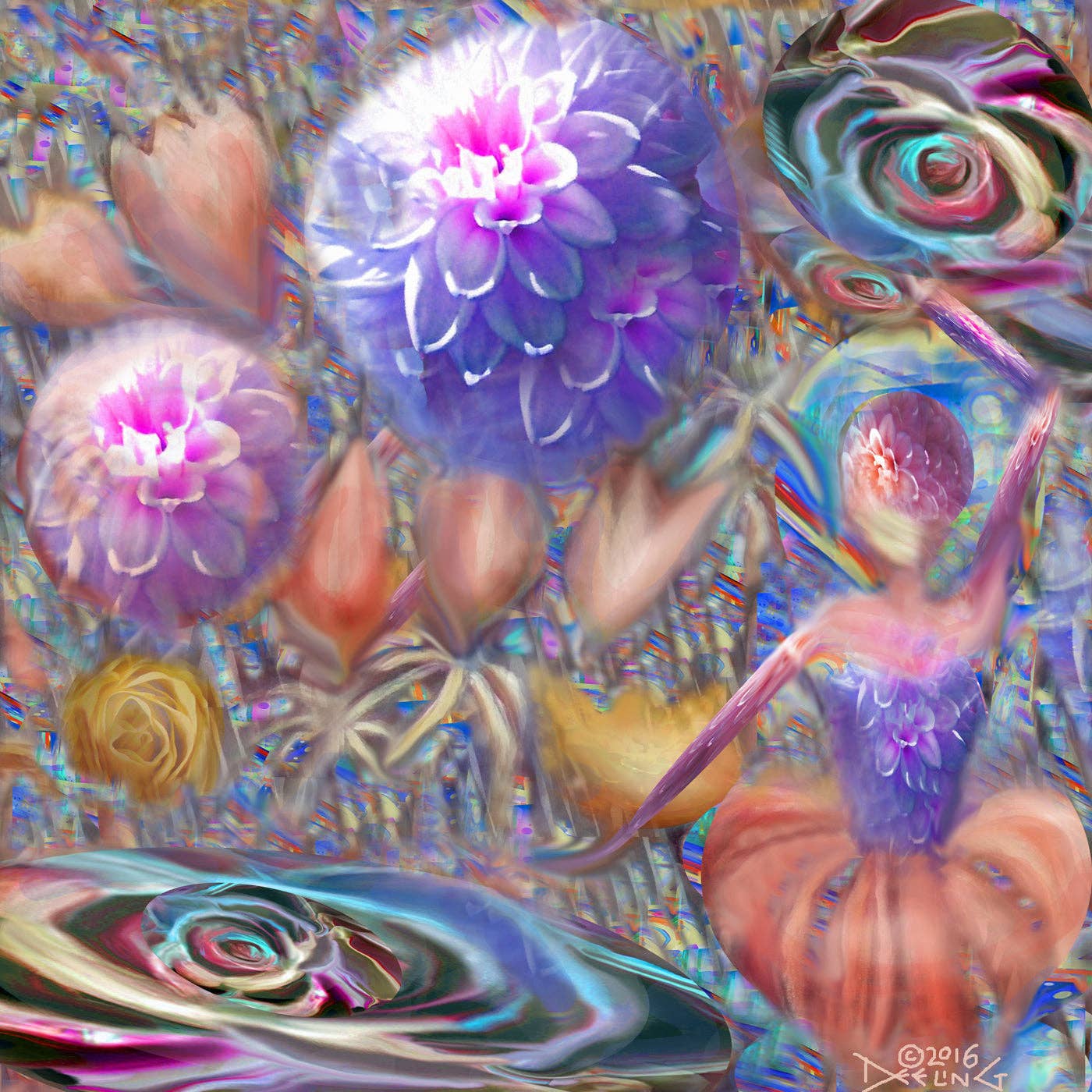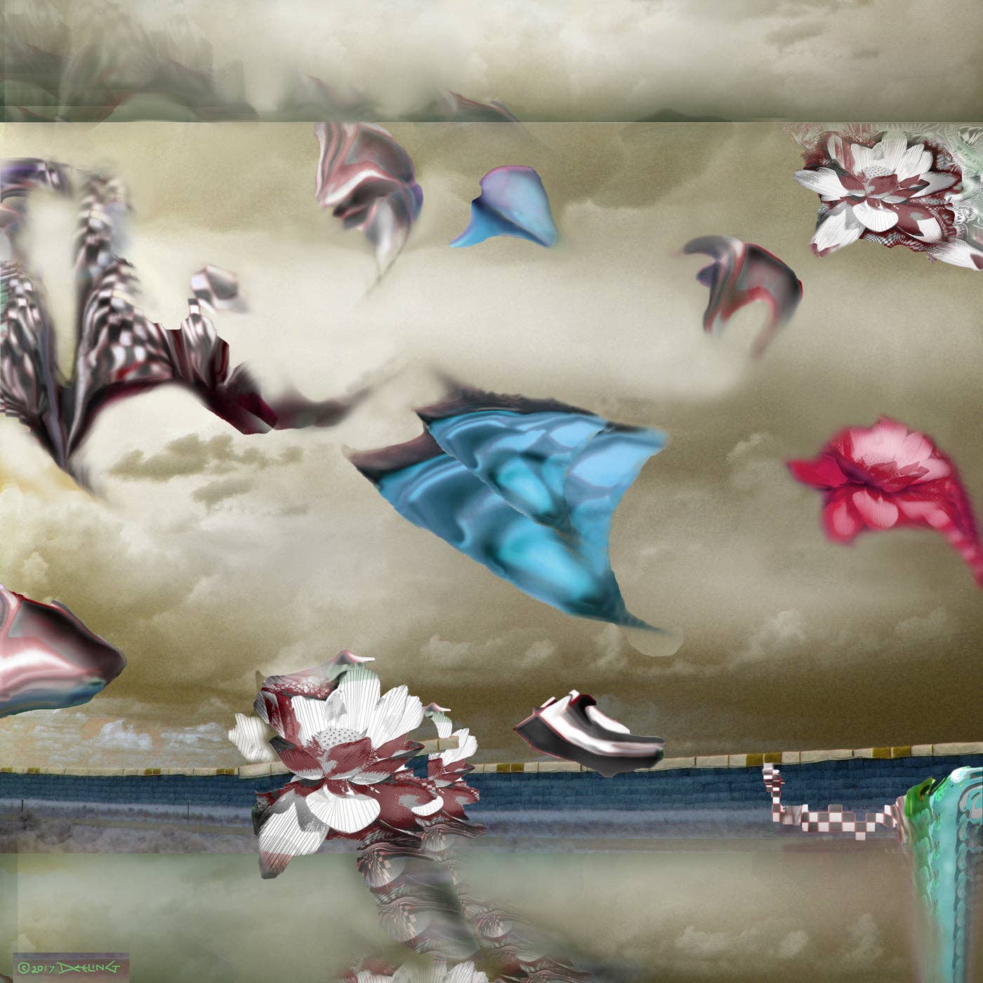 El arte de Deeling C. Gregory, nacida en Hawái, ha sido tan ecléctico como las muchas décadas que lo ha estado haciendo. Desde murales públicos a gran escala con sus búfalos «burbujeantes» hasta mezclas abstractas digitales casi diarias (que comenzaron en 2015), gran parte de su obra gira hacia lo surrealista. Estudió matemáticas en Stanford y ha estado enganchada al arte desde que su hermana la animó a tomar clases de dibujo figurativo. Viajó a Europa, terminó sus estudios en Stanford y asistió al Instituto de Arte de San Francisco. Deeling crea desde su estudio en Montana, cerca de un puesto nuclear en el corazón de una zona agrícola y ranchera mayoritariamente rural. Se inspira en una infancia encantada como quinta hija de padres chinos y griegos, en una estancia de treinta años en el área de la bahía de San Francisco y en el entorno austero pero hermoso de su hogar actual.
