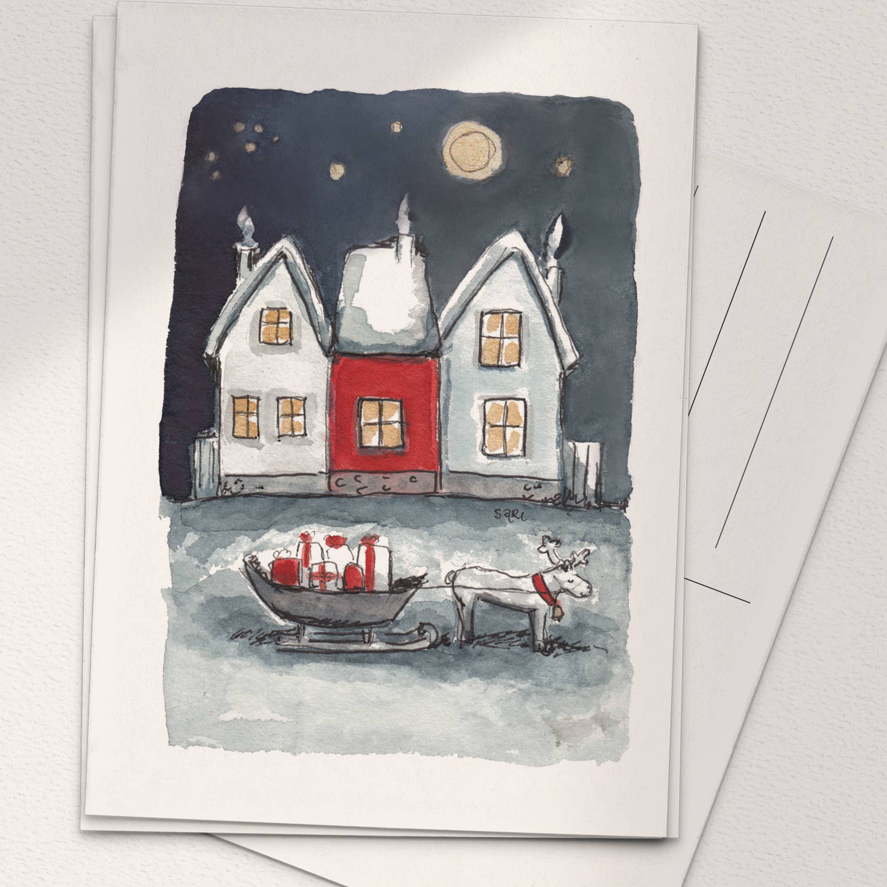 Sari es una artista finlandesa, estudió arte en la escuela de arte local de Pori y se graduó en 1995. Luego se trasladó al Círculo Polar Ártico y fundó su negocio allí en Rovaniemi en 1998, pero hoy en día vive en su lugar natal Ulvila. Desde el inicio de su negocio hace más de 20 años ha pintado cientos, si no miles de acuarelas, con las que desea traer felicidad y alegría a la gente. Hay muchos tipos diferentes de diseños y tamaños de tarjetas para elegir, para todo tipo de momentos de la vida, como el nacimiento de un niño, la boda y la graduación. Todo el tiempo tiene nuevas ideas apareciendo en su cabeza para llevar un poco de arte a la vida cotidiana.