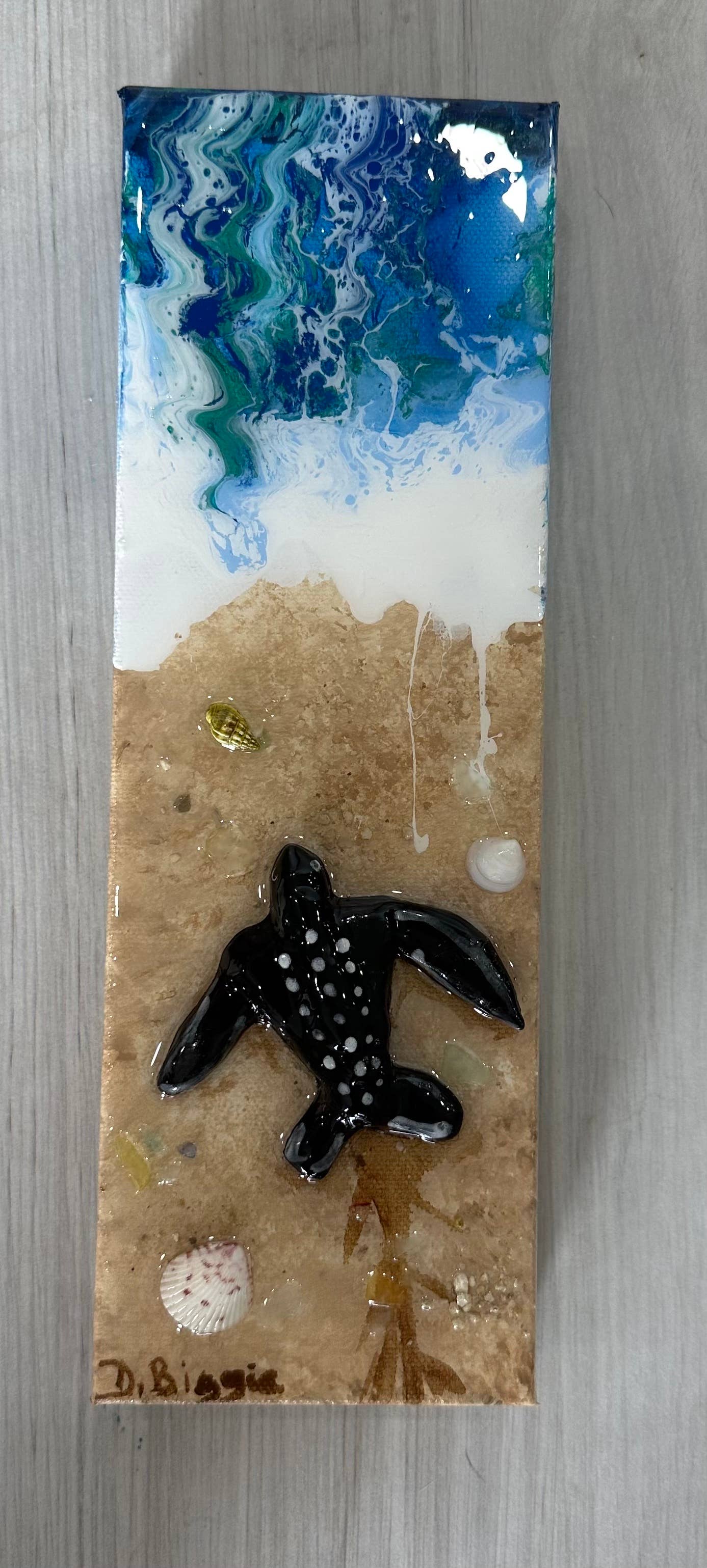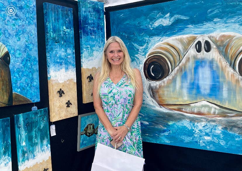 D. Biggie es biólogo y artista. Crea arte para ayudar a apoyar la conservación de las tortugas marinas. Crea Jeweled Jellys (c) para recordar que las medusas son el alimento preferido de la tortuga laúd y que pueden confundirse con el plástico. Cada compra ayuda a una tortuga marina.