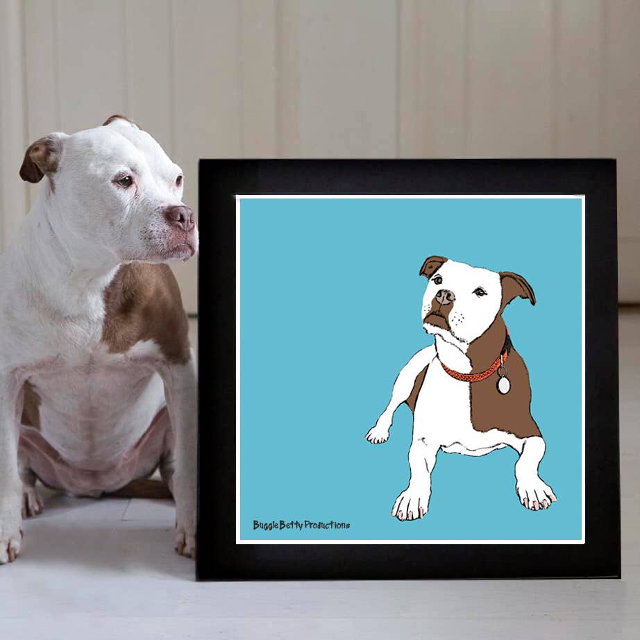 Hola, mi nombre es Buggle Betty y soy Staffie Cross. No tuve el mejor comienzo en la vida, hasta que mi madre y papá me adoptaron. ¡Fue entonces cuando mi cola se movió por primera vez! ¡Ahora tengo una vida fantástica con muchos abrazos y golosinas! Soy la diseñadora y propietaria de Buggle Betty Productions. Con la ayuda de mi familia adoptiva, incorporo mi pasión por la fotografía y los gráficos y los convierto en artículos encantadores. Muchos de mis amigos se han convertido en trabajos de arte gráfico como yo y aparecen en mis productos. Mis productos son un gran regalo para los amantes de los perros de todas partes. Todo se fabrica en el Reino Unido y doy una pata de aprobación antes de enviar cada pedido. ¡Un gran guapo para visitar mi tienda!