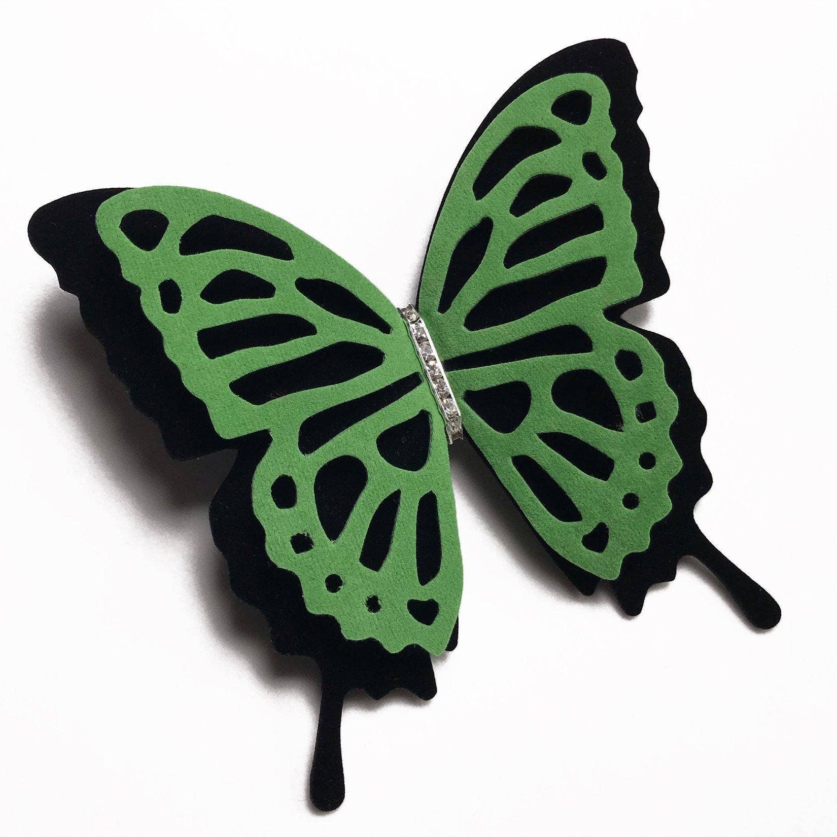 Comencé a tener una profunda afinidad por las mariposas en una etapa de transición de mi vida y las vi como un hermoso símbolo de transformación. Tenía un negocio de impresión de lienzo en ese momento y una gran impresora de inyección de tinta. Recuerdo cómo pegué un trozo de tela a una hoja de aluminio e imprimí mi primera mariposa en ella. Más tarde seguí las técnicas de reafirmación de telas y pronto descubrí todo el proceso de creación de hermosas mariposas de seda. Después de tener lista la colección de mariposas de seda, un amigo me sugirió que intentara usar diferentes materiales además de la seda. Así es como descubrí las sábanas de terciopelo, la piel sintética y las últimas sábanas con purpurina de material divertido. Después de crear los accesorios habituales como collares, pendientes, pulseras, alfileres, etc., se me ocurrió una idea para accesorios de zapatos de mariposa y accesorios de cordones de zapatos. Tengo una bandeja larga junto a la puerta de entrada y todos los días, dependiendo del color de mi atuendo, elijo un alfiler de mariposa a juego y una pulsera o pendientes.