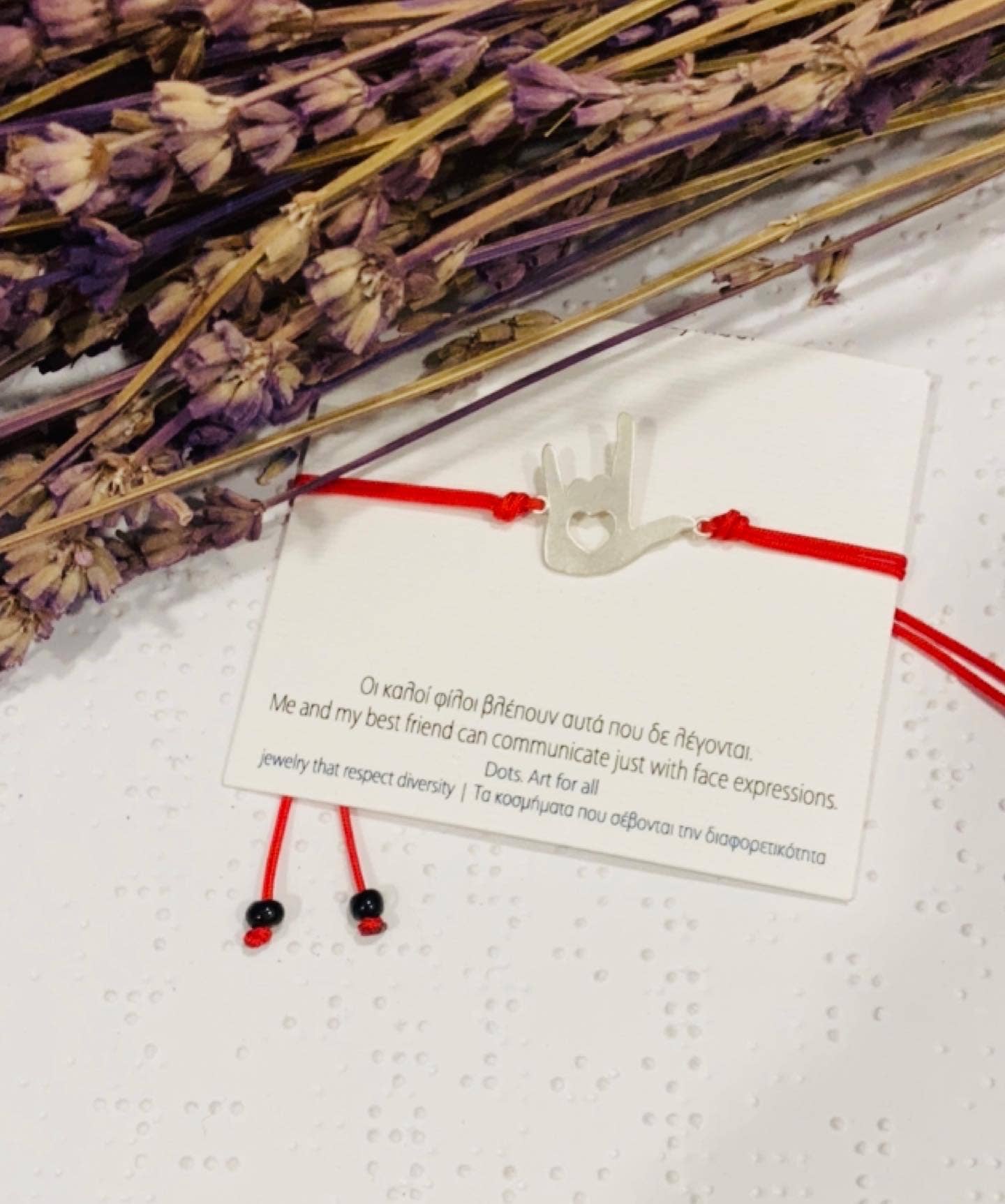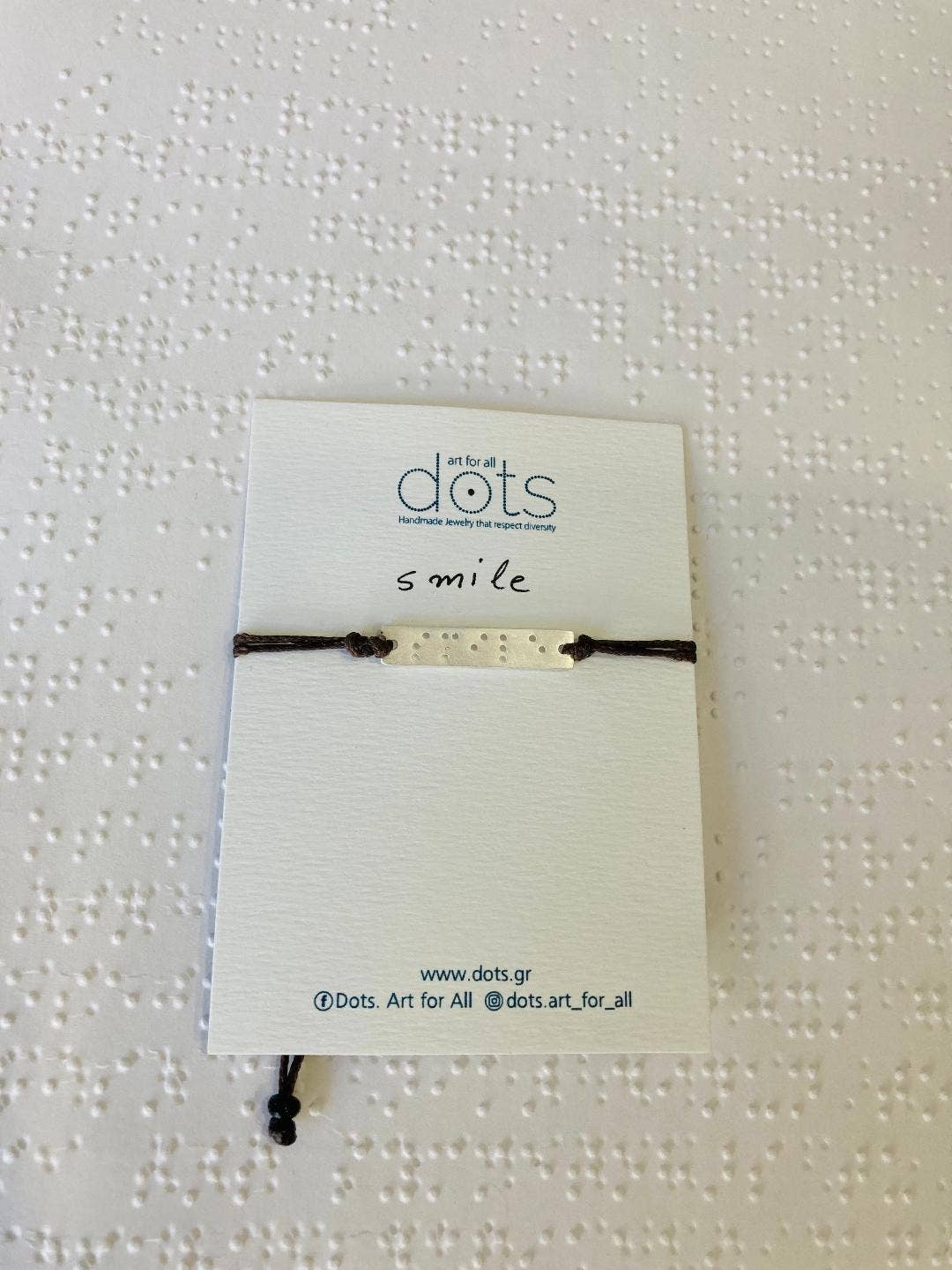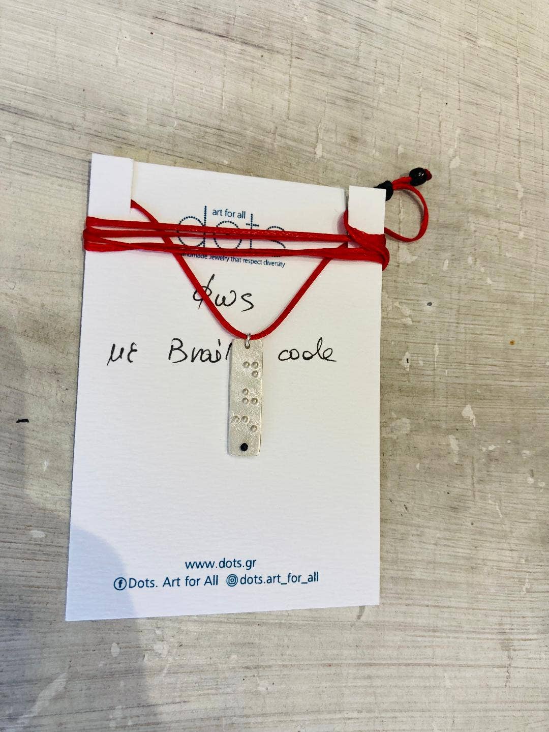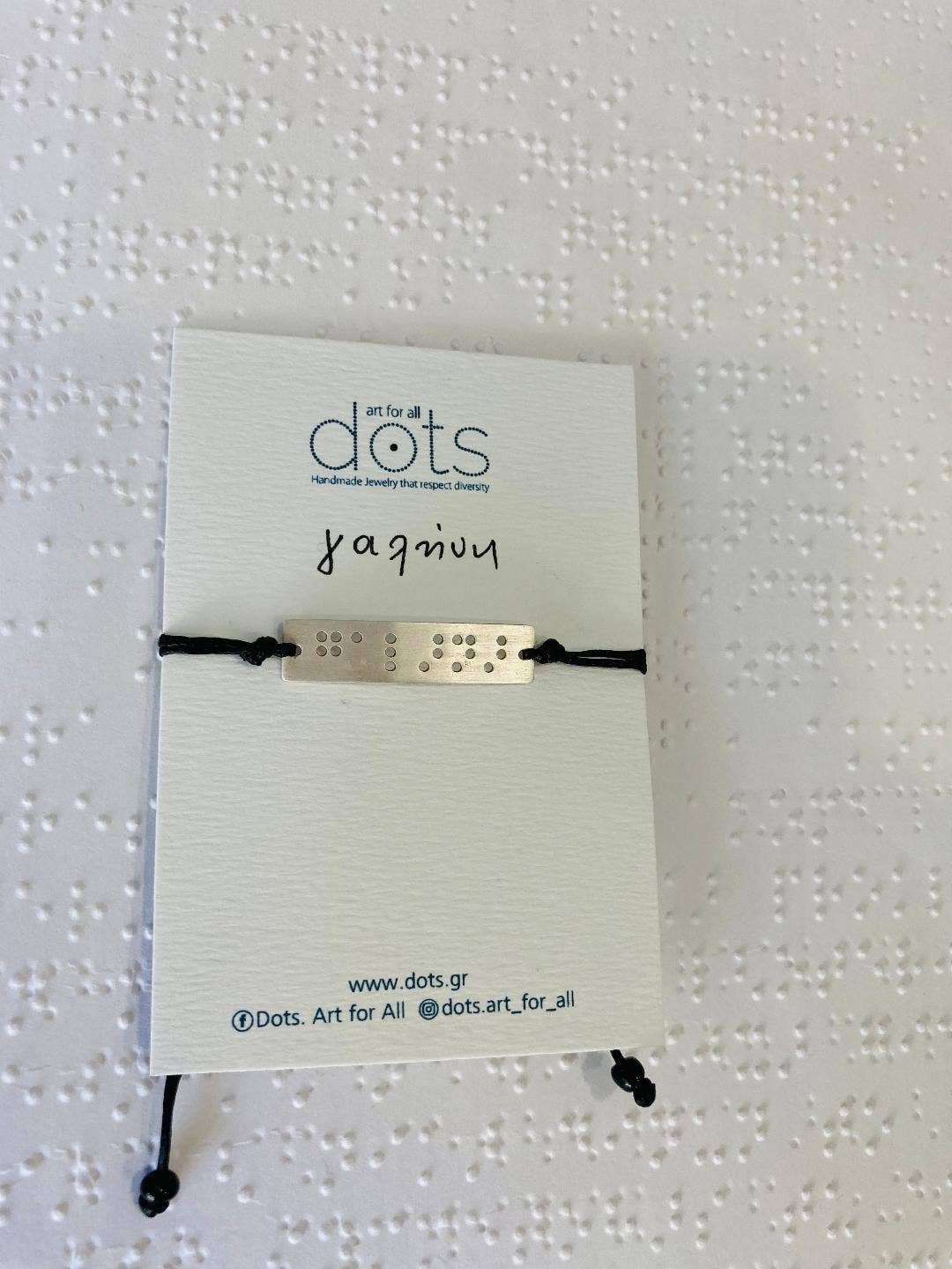 Dots .Art for all transmite mensajes y deseos escritos en código Braille, lenguaje de señas y varios símbolos, una idea única e innovadora en el campo del arte y la moda. Una colección que atrae a todos aquellos que apoyan la diversidad y quieren dar sentido a sus joyas. Con un estilo sencillo, pocas palabras y muchos significados, joyas con símbolos y puntos Puntos. El arte para todos nos impulsa a ver el mundo con otros ojos... Un esfuerzo a través del arte para transmitir el mensaje de igualdad y paridad y para contribuir a la conciencia social y la integración. Maofi Eugenia, escondida detrás de esta idea, estudió Psicología y trabajó en Educación Especial durante más de 25 años. Inspirada por los sistemas de comunicación alternativos e impulsada por su amor por las personas con discapacidades, quiso apoyar la diversidad a través del arte creando The Dots. Colección Arte para todos, que se renueva y enriquece constantemente.