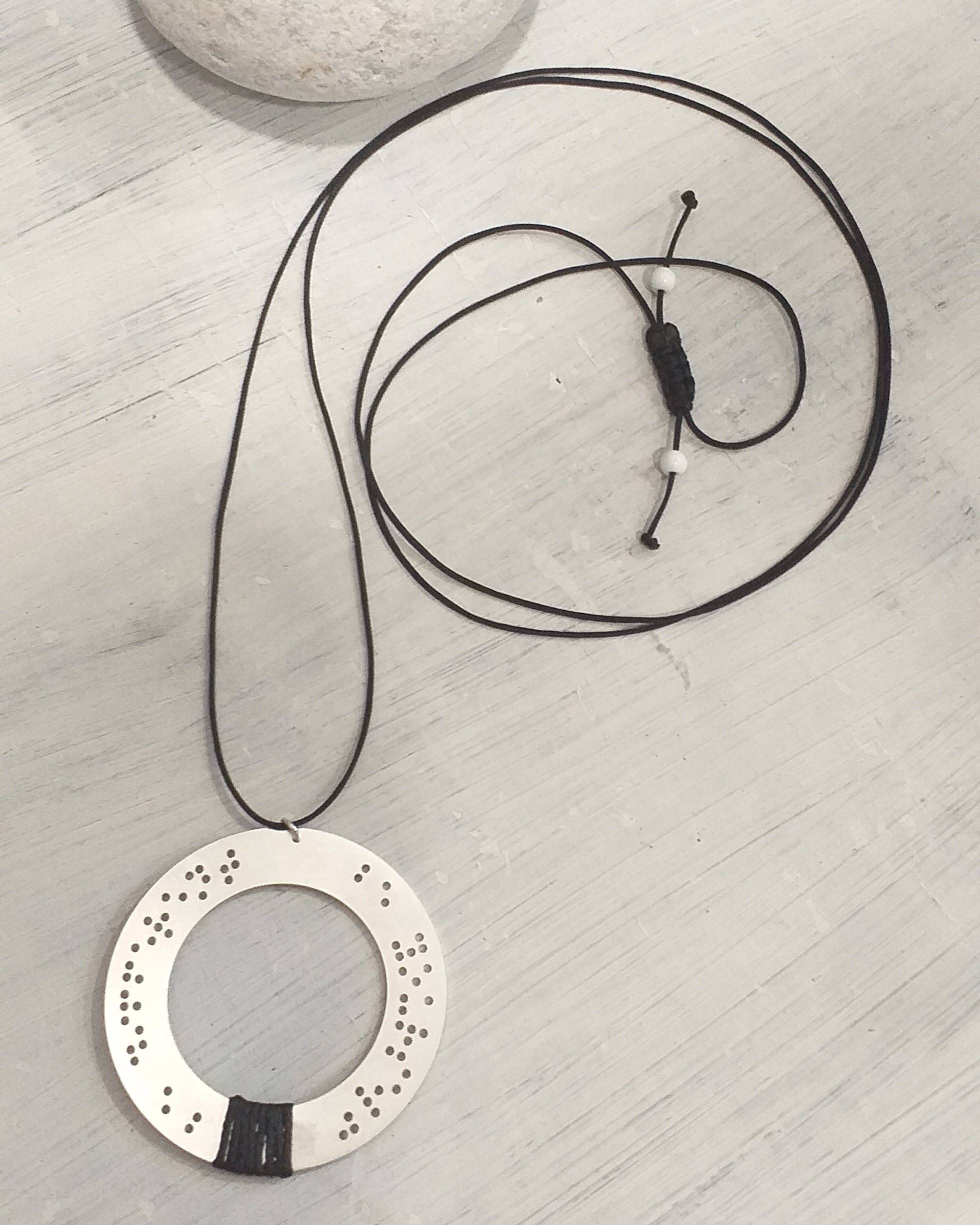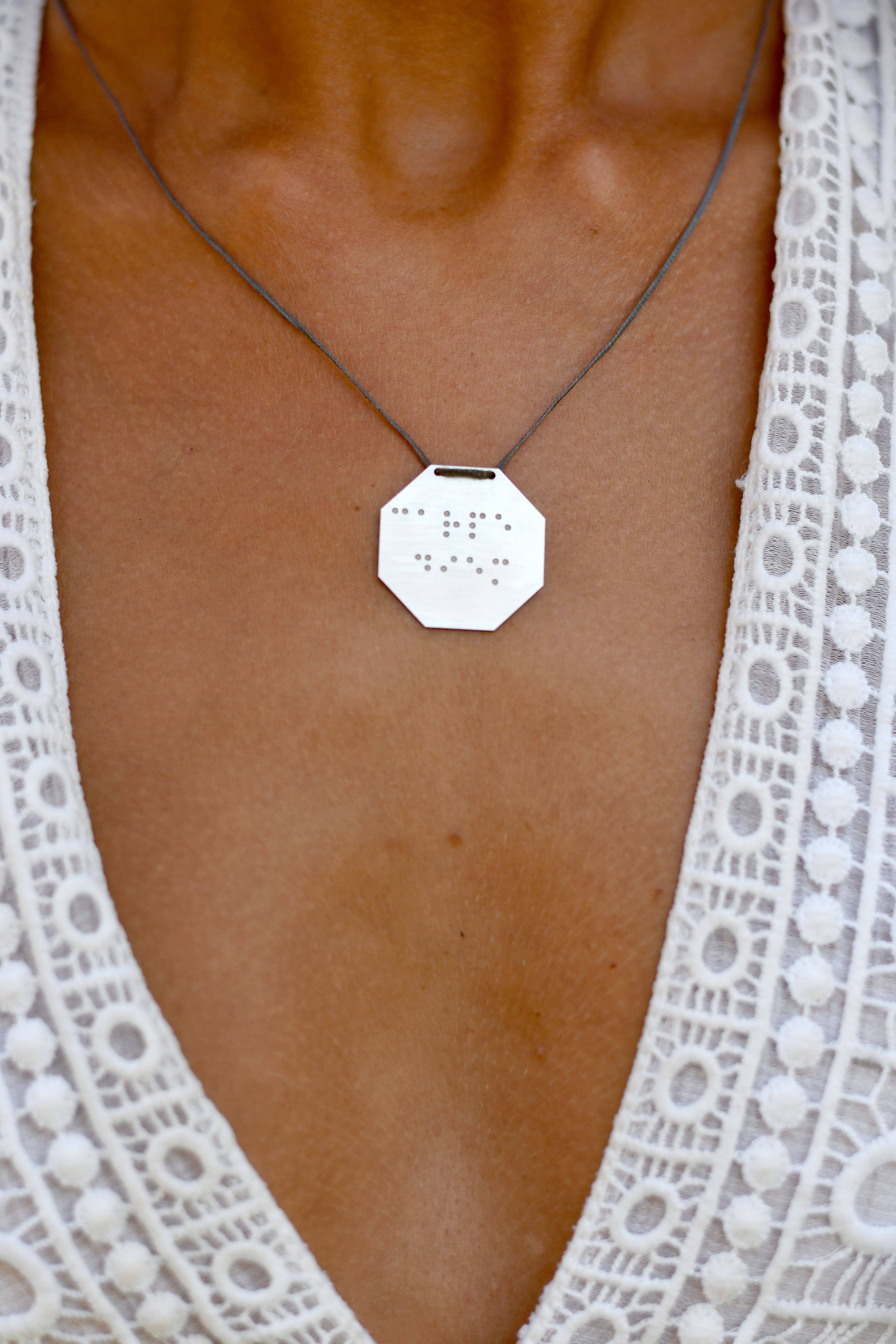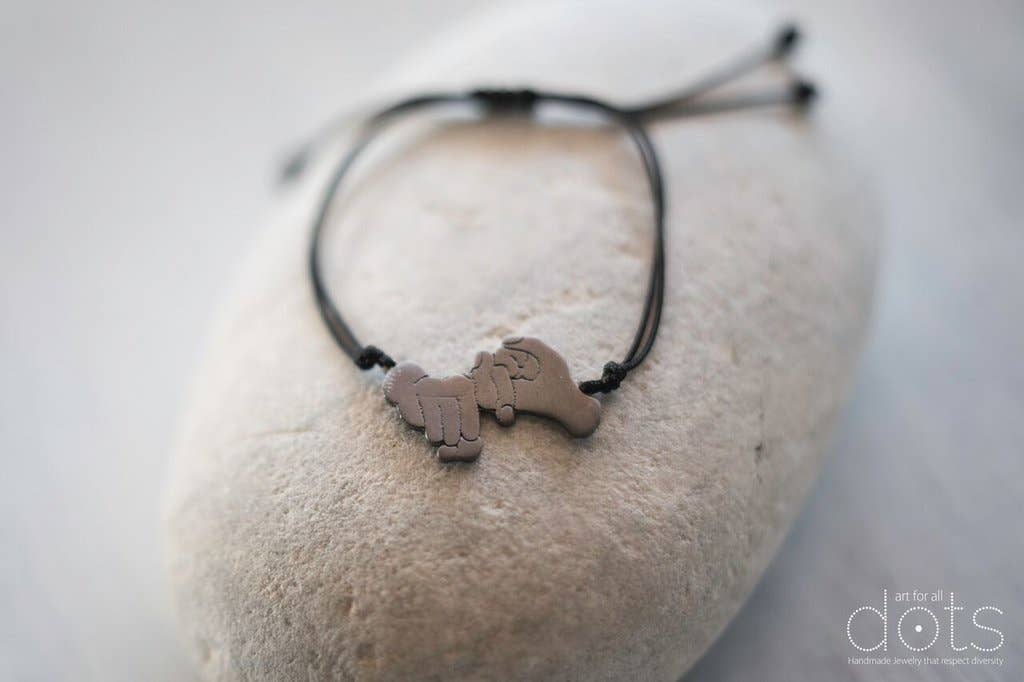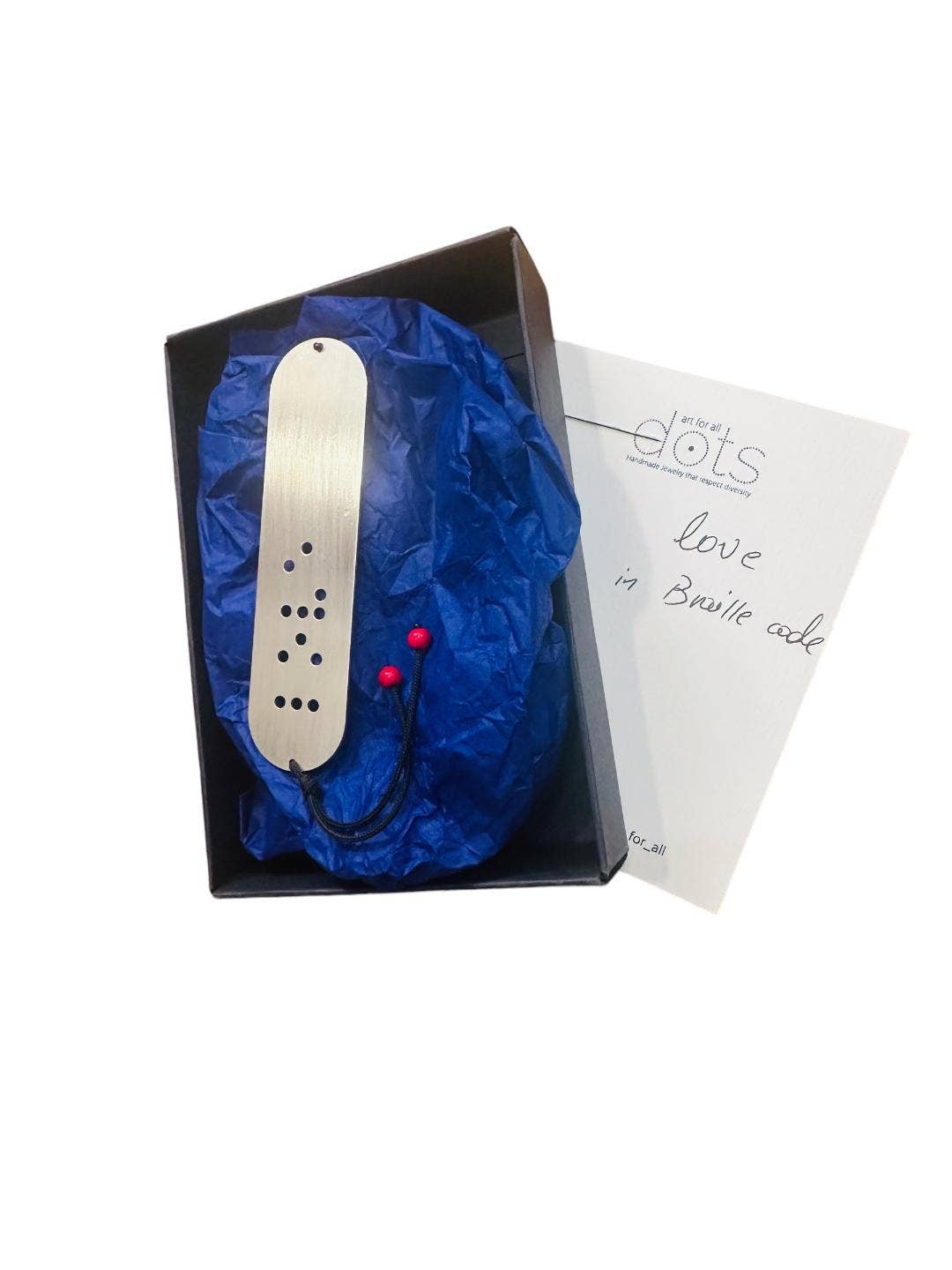 Dots .Art for all transmite mensajes y deseos escritos en código Braille, lenguaje de señas y varios símbolos, una idea única e innovadora en el campo del arte y la moda. Una colección que atrae a todos aquellos que apoyan la diversidad y quieren dar sentido a sus joyas. Con un estilo sencillo, pocas palabras y muchos significados, joyas con símbolos y puntos Puntos. El arte para todos nos impulsa a ver el mundo con otros ojos... Un esfuerzo a través del arte para transmitir el mensaje de igualdad y paridad y para contribuir a la conciencia social y la integración. Maofi Eugenia, escondida detrás de esta idea, estudió Psicología y trabajó en Educación Especial durante más de 25 años. Inspirada por los sistemas de comunicación alternativos e impulsada por su amor por las personas con discapacidades, quiso apoyar la diversidad a través del arte creando The Dots. Colección Arte para todos, que se renueva y enriquece constantemente.