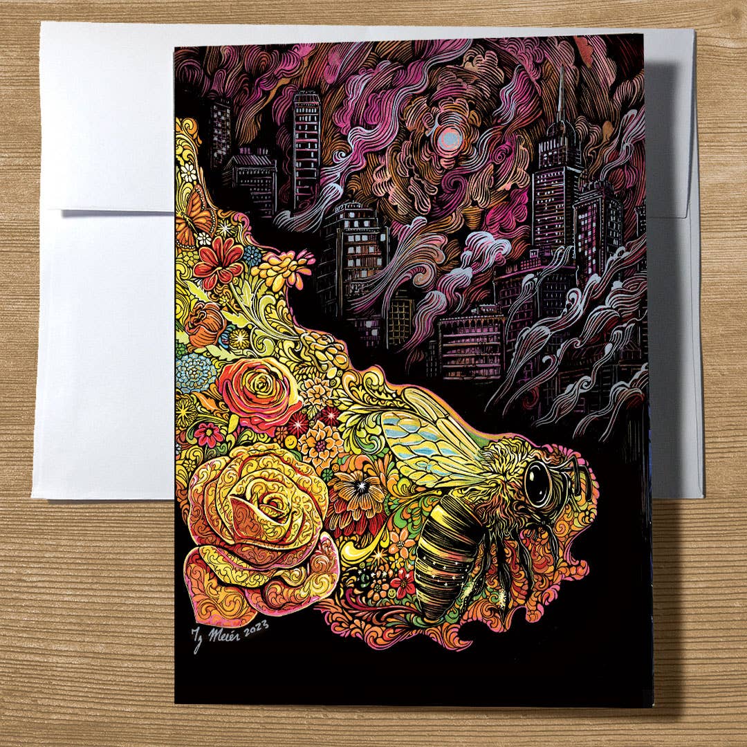 El arte y la fantasía de Ty Meier, un artista de Concord, NH. "Reenfoca en los temas mucho más grandes de la vida: El fenómeno improbable de nuestra existencia y las epifanías de la experiencia. Somos criaturas hermosas rodeadas de oscuridad. Practica el asombro. Nunca te estanques. Paz ∙ prosperidad ∙ felicidad." Ty Meier, un artista de San Francisco trasladado a Concord, New Hampshire, se vio obligado a conseguir un trabajo en una imprenta llamada Capitol Copy (vecina al edificio del Capitolio del Estado), cuando quince mercados de arte de fin de semana fueron cancelados por lluvia consecutivamente. ¡Bienvenido a Nueva Inglaterra! Desde entonces, ha sacado el mejor provecho de la situación, disfrutando del trabajo, y Sam Mostue, el gerente y único otro trabajador en Capitol Copy, dio la bienvenida y animó a Ty a producir tarjetas de felicitación a partir de su arte caprichoso y sincero. Con cierto éxito en el centro de New Hampshire, se han asociado para producir tarjetas de felicitación al por mayor en Faire.com y están emocionados de ver qué sucede a continuación.