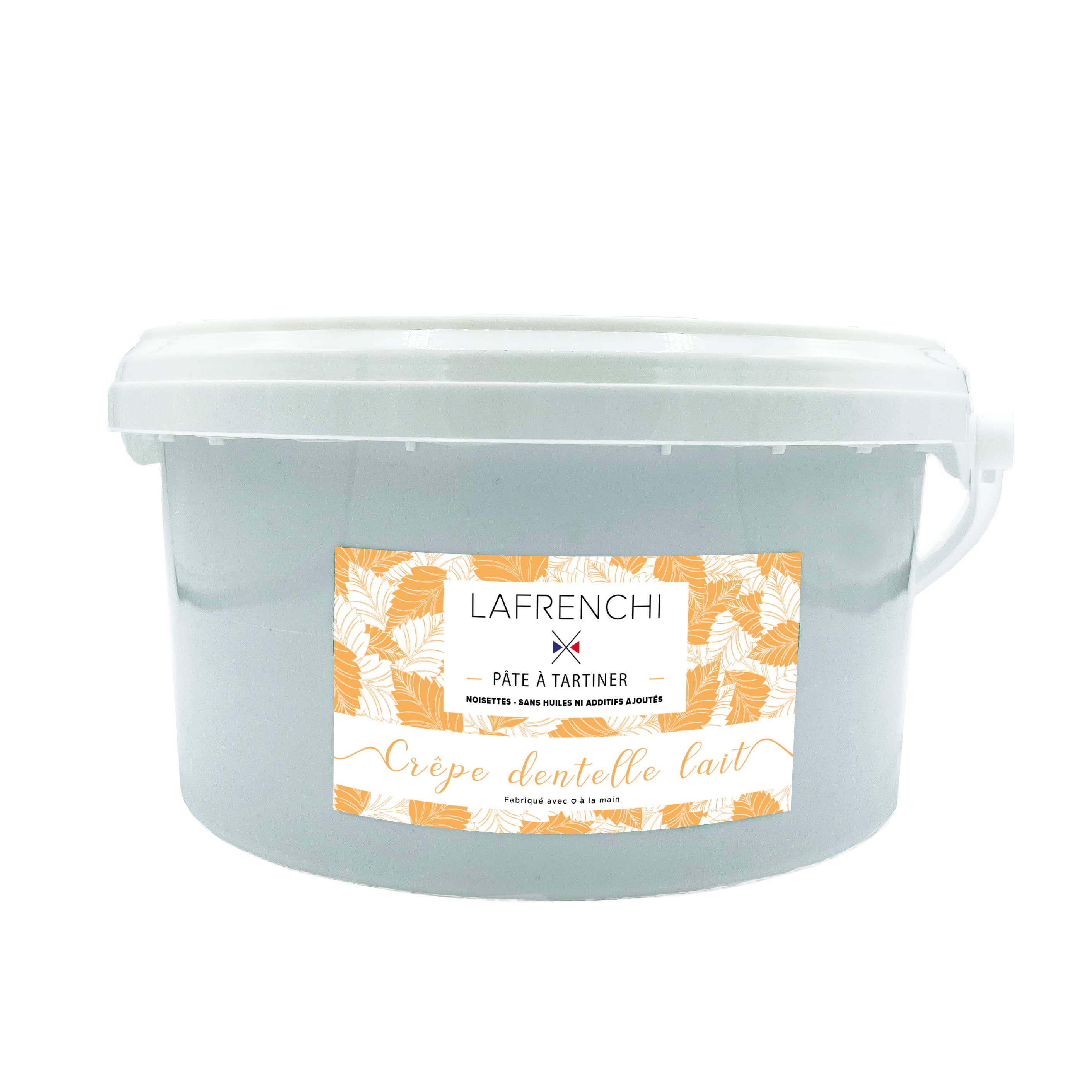 Lafrenchi es una gama de cremas para untar y untar de caramelo elaboradas siguiendo la más pura tradición pastelera, a partir de ingredientes cuidadosamente seleccionados. Imaginadas por Julie, pastelera formada en la escuela Ferrandi, nuestras recetas te sumergen en un mundo de delicadeza. El chocolate para untar está hecho con al menos un 40% de frutos secos, un buen chocolate (¡y no cacao en polvo!) y no contienen absolutamente ningún aceite. Están hechos de praliné a la antigua usanza que servimos con varios frutos secos: avellanas, cacahuetes o pecanas. Los caramelos para untar están hechos de mantequilla, nata entera y azúcar francesa. Nuestras recetas están disponibles en varios formatos: - Frascos de 250 g (venta al por menor) - Frascos de 100 g o 35 g (caja o caja de regalo) - Cubos de 2 kg (formato CHR) Todos nuestros productos no tienen aditivos, conservantes ni sabores añadidos y están fabricados en Francia.