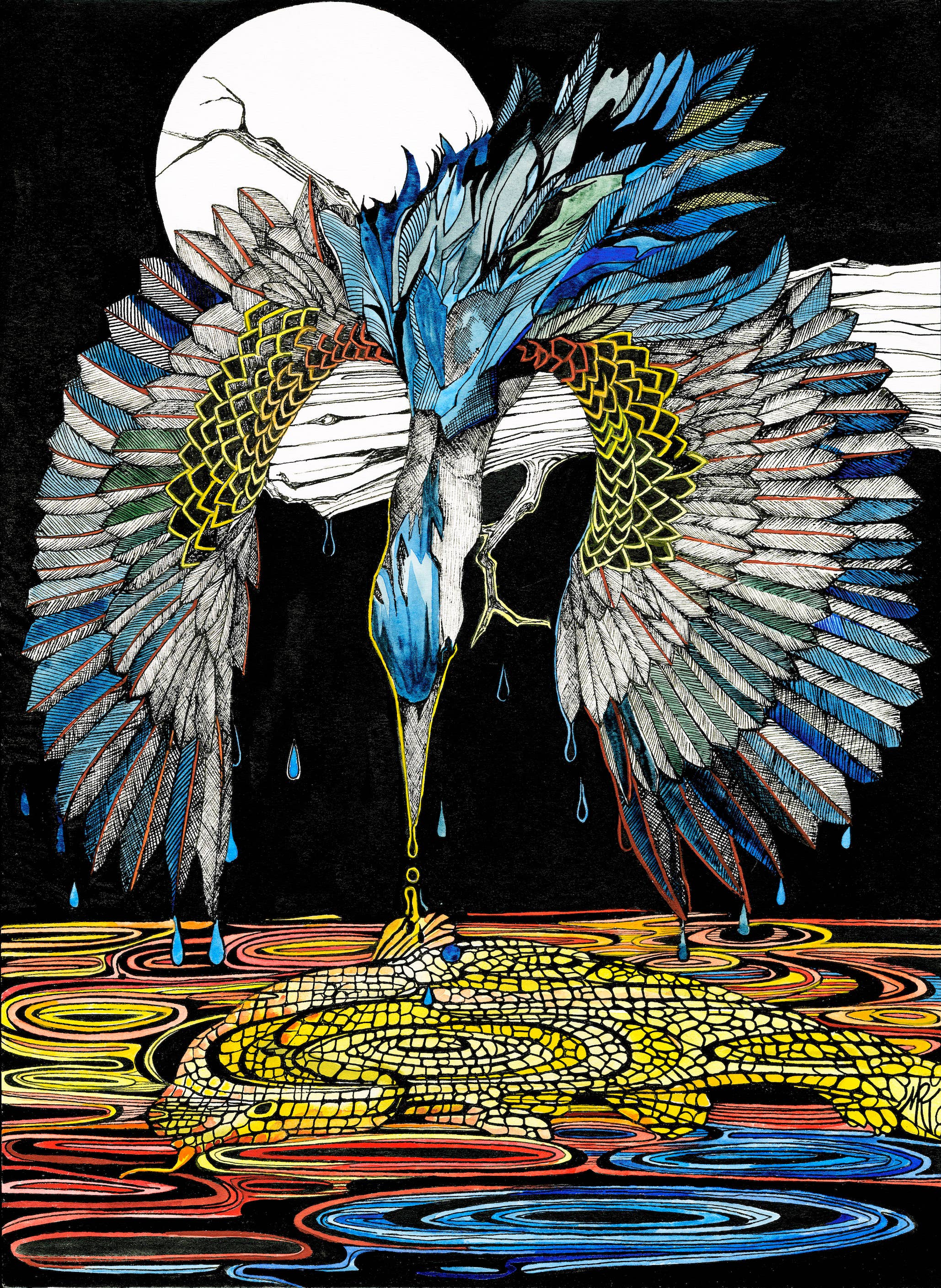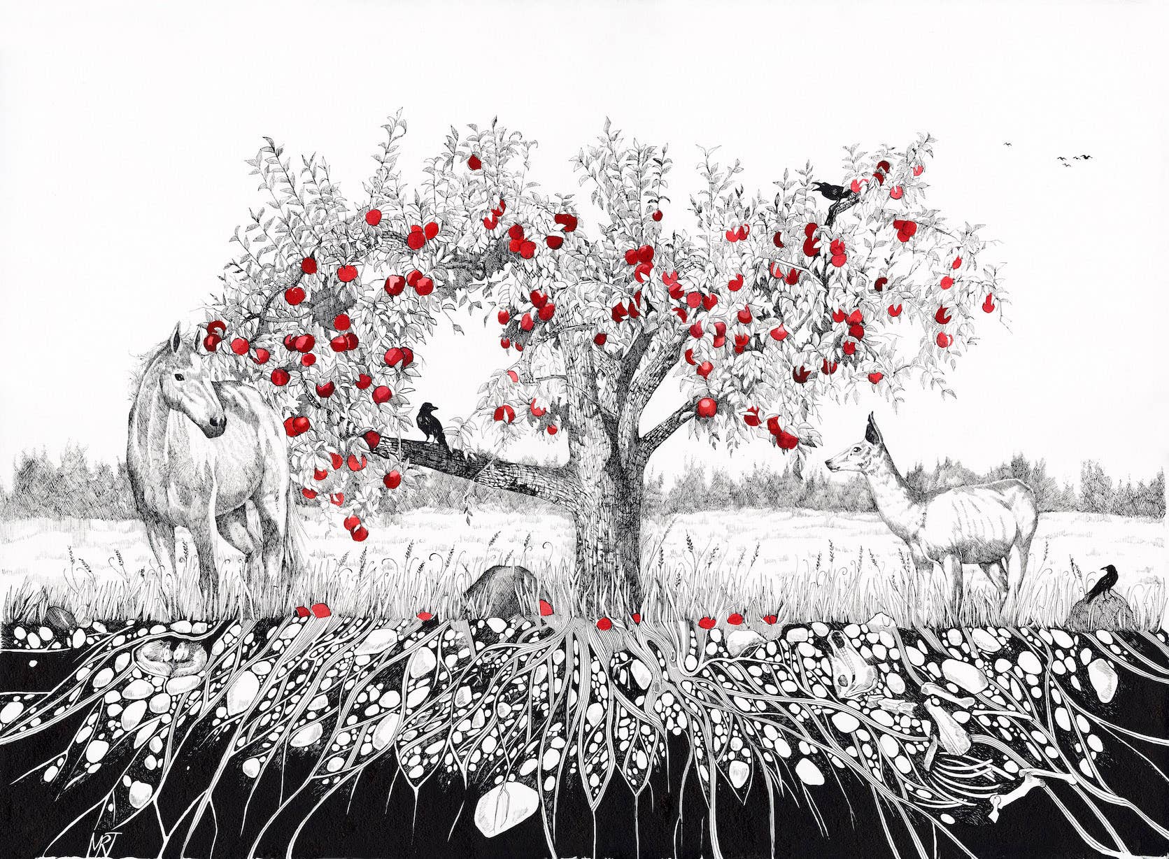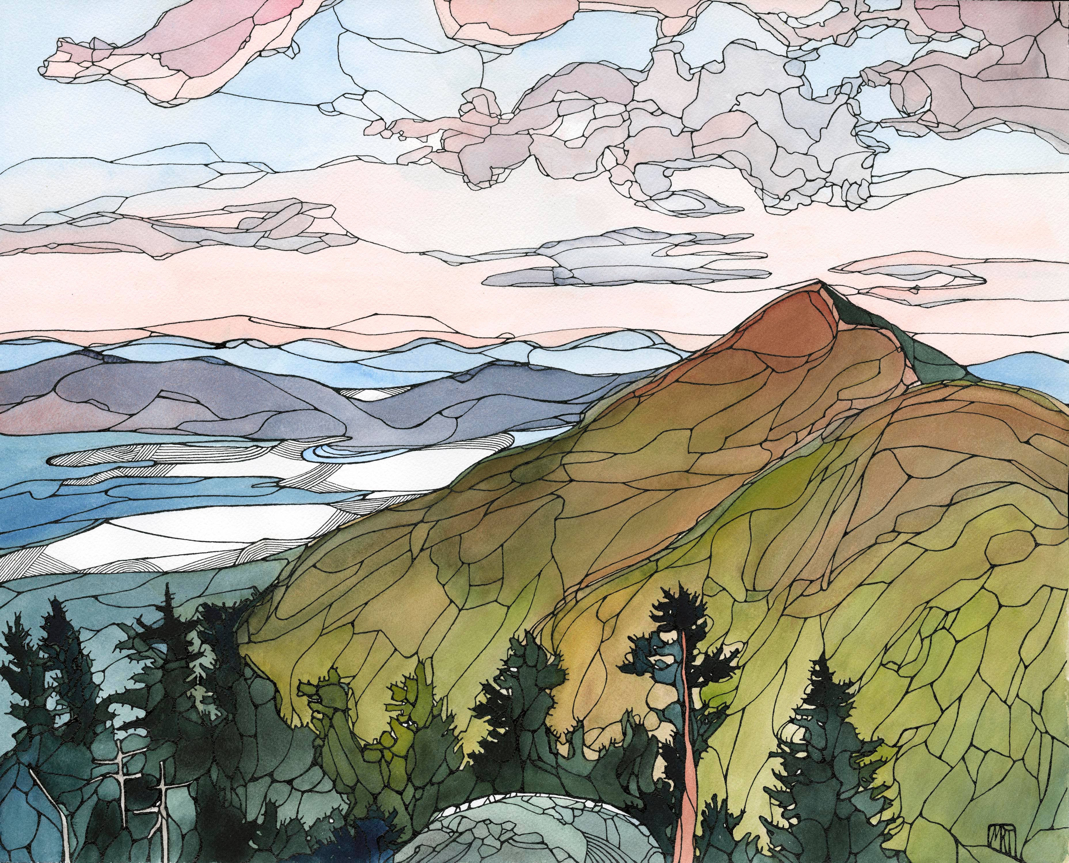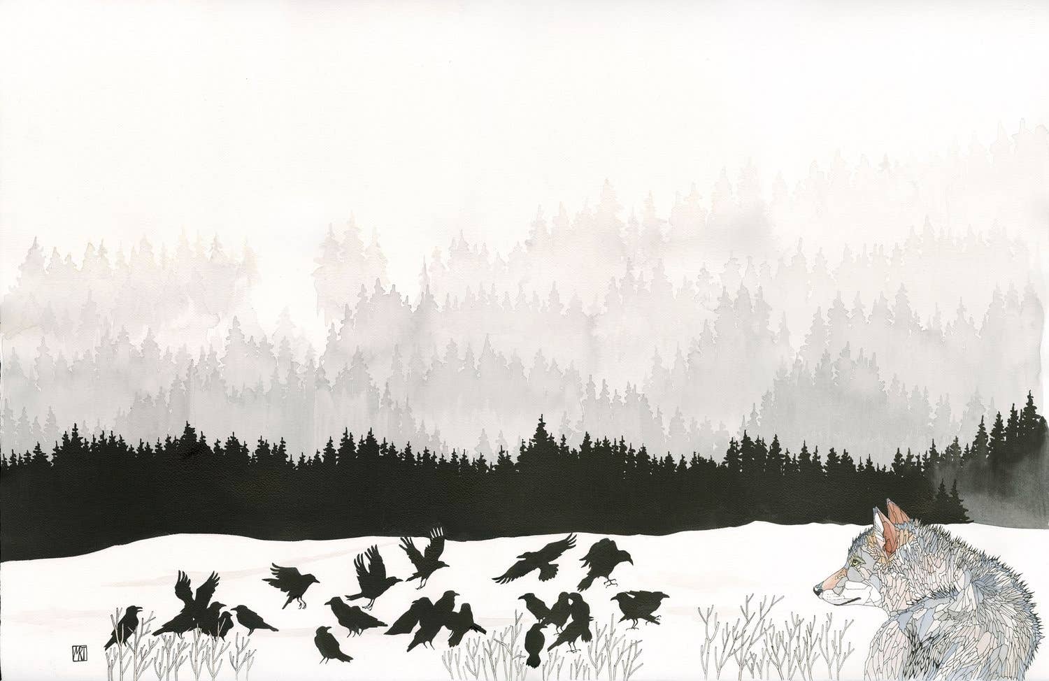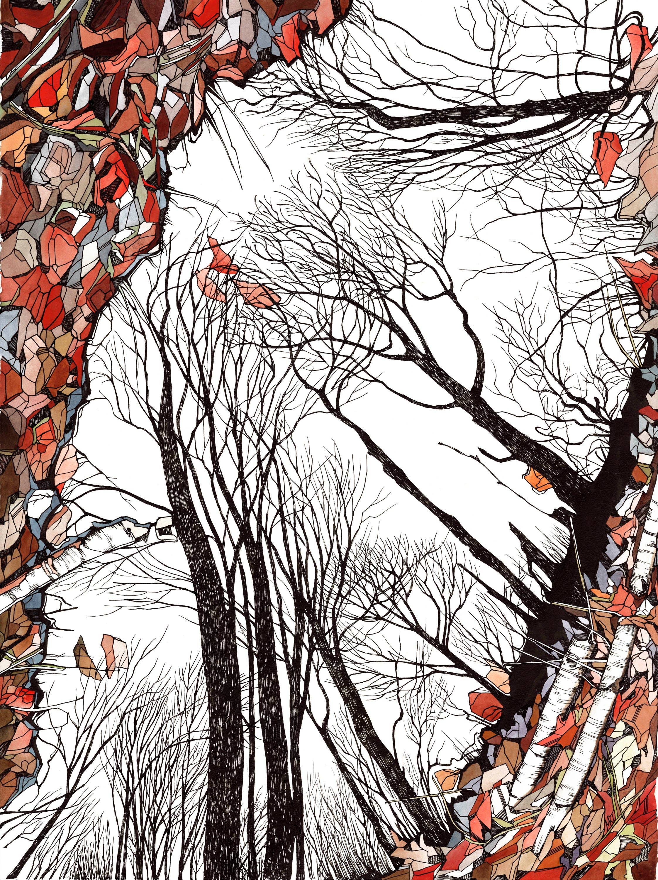 Cada obra de arte tiene una historia que contar, mi trabajo es poner tinta y color al papel para contar esa historia. Estudié en casa en la zona rural de Maine, tuve la suerte de pasar horas sin restricciones en campo y bosque, estudiando nuestro mundo con atención que solo los niños pueden hacerlo. Nunca dejo de hacer preguntas, ni tampoco lo hace mi arte. Cada pieza tiene una narración y cada persona escucha una historia diferente. Mis tarjetas se imprimen localmente en papel reciclado y se empaquetan en una funda protectora biodegradable.