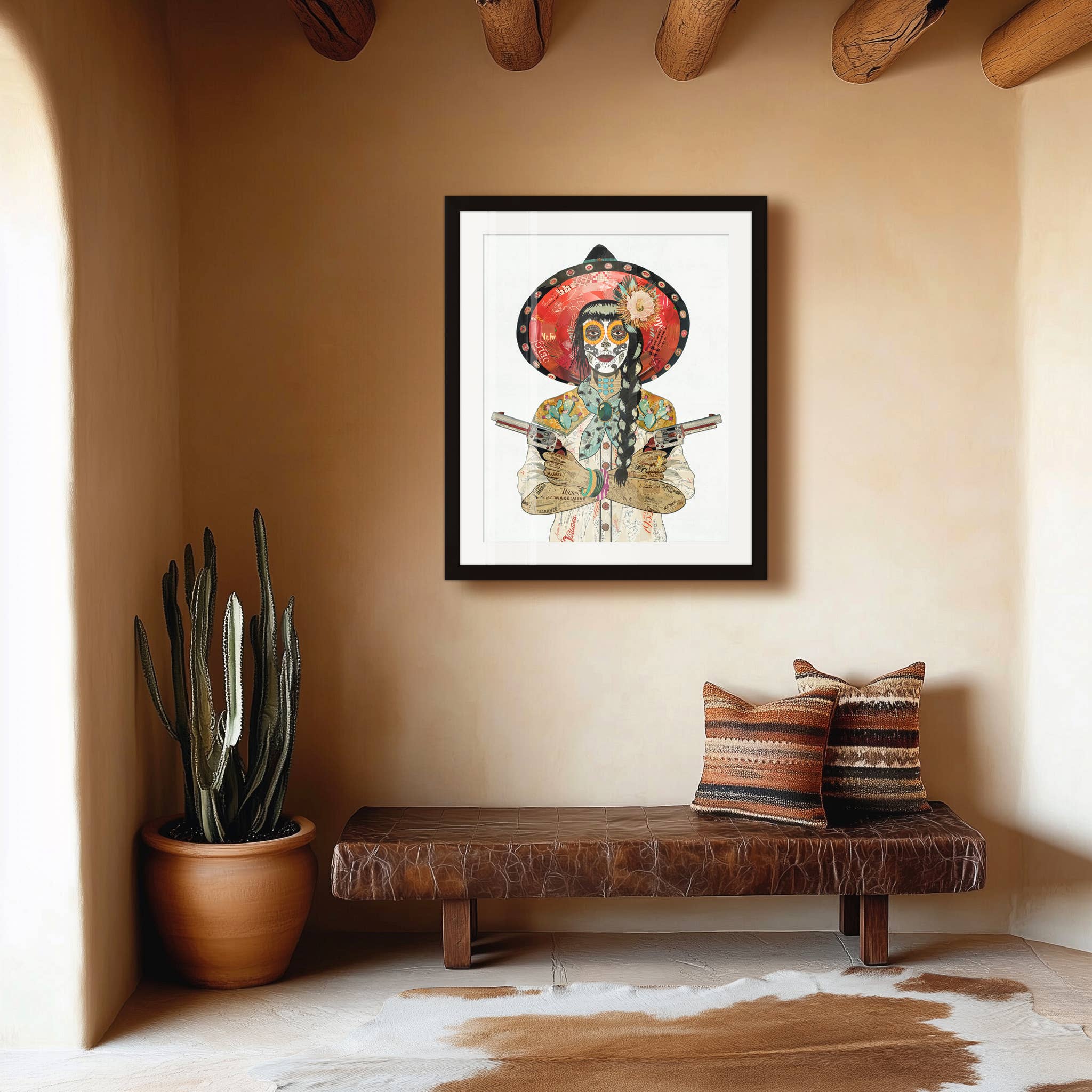 Edición limitada de impresión giclée del artista de Denver Dolan Geiman. Cada impresión es una reproducción detallada de un collage original de papel de Geiman impreso en papel artístico mate, firmado y numerado. Cada collage original de papel fue construido a partir de materiales reciclados y reutilizados. *Tamaños: 24 x 42 || 32 x 56 *Embalaje: las impresiones pequeñas sin marco se empaquetan en una funda de plástico sellada con respaldo de núcleo de espuma || las impresiones medianas y grandes sin marco se envían enrolladas dentro de su propio tubo de kraft individual con tapa etiquetada (ver fotos) *Colgadores: busca el producto Colgador de Impresión | Magnético | Nogal para detalles del producto colgador de nogal. *Envío: las impresiones sin marco se envían en 1-3 días. Decoración vaquera del oeste. Vaquero vintage del oeste en caballo en el desierto con cactus. Jinete solitario.