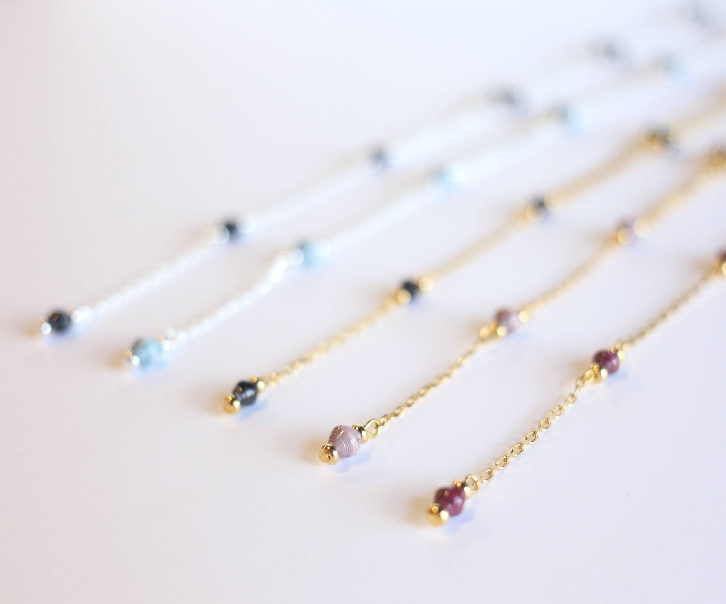 Esta delicada pieza triplica el regalo con un cristal Swarovski®, cuentas de papel hechas a mano y cuentas de cilindro de hueso directamente de Camboya. Consejo: Collares adicionales de hebras cortas como el Nadia, Anne o Annie. DETALLES Aproximadamente 12.5" de largo para colgar. Cuentas de papel enrolladas a mano, cristal Swarovski® y chapado en oro de 18 quilates o plata de ley.