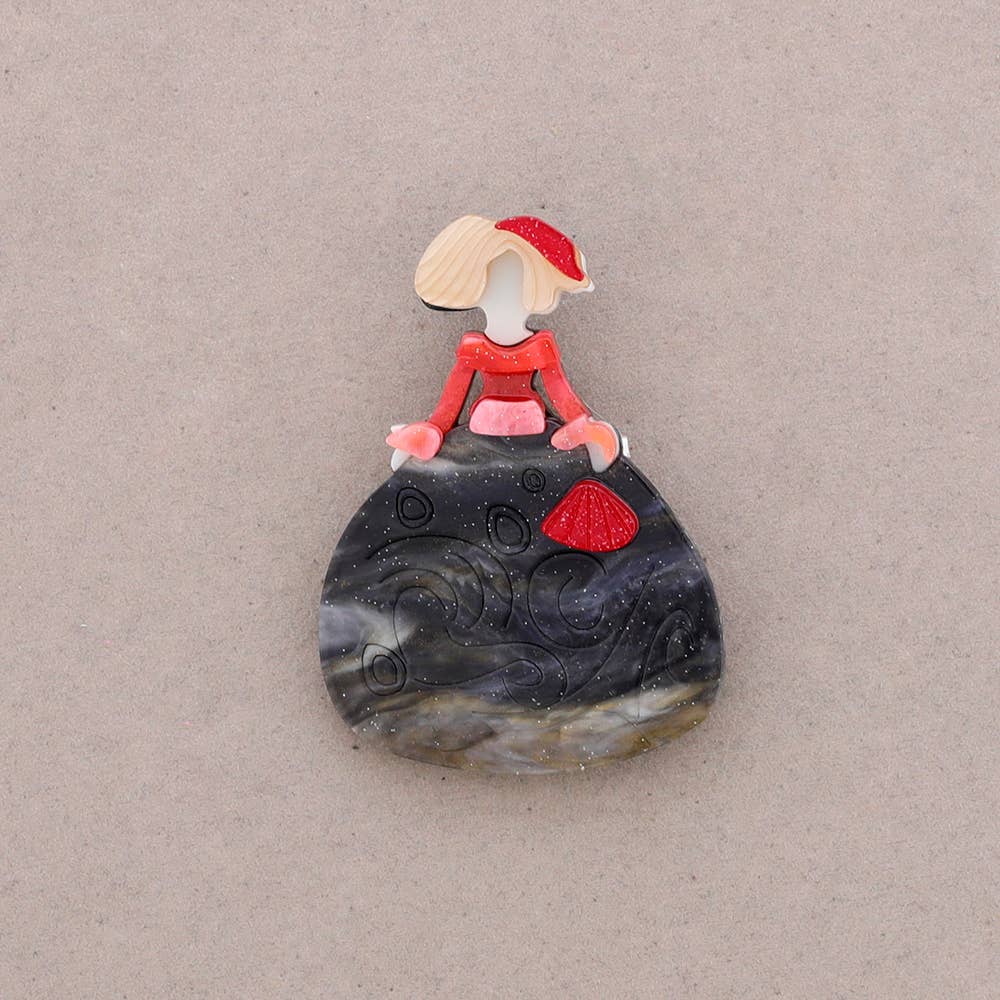 Broche de acero inoxidable dorado con forma de coral esmaltado colorido y una pequeña estrella de mar dorada. La joya está garantizada libre de níquel, cadmio y sales de plomo.