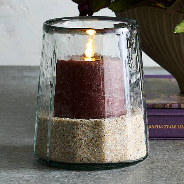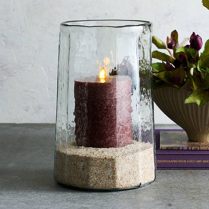 Nuestros decantadores de vidrio texturizado hechos a mano presentan bases tipo punt y tapones altos de aluminio martillado con acabado en latón envejecido. El cuerpo de vidrio ligeramente ondulado ofrece un buen agarre y sensación al tacto. Disponibles en tres formas distintas, estos recipientes de vidrio aptos para alimentos son una adición atractiva para cualquier carrito de bar o área de comedor, ya sea llenos con bebidas favoritas o simplemente vacíos. Dimensiones: 21 cm de diámetro x 22,2 cm de alto Capacidad: 2,25 litros Peso: 1,14 kg