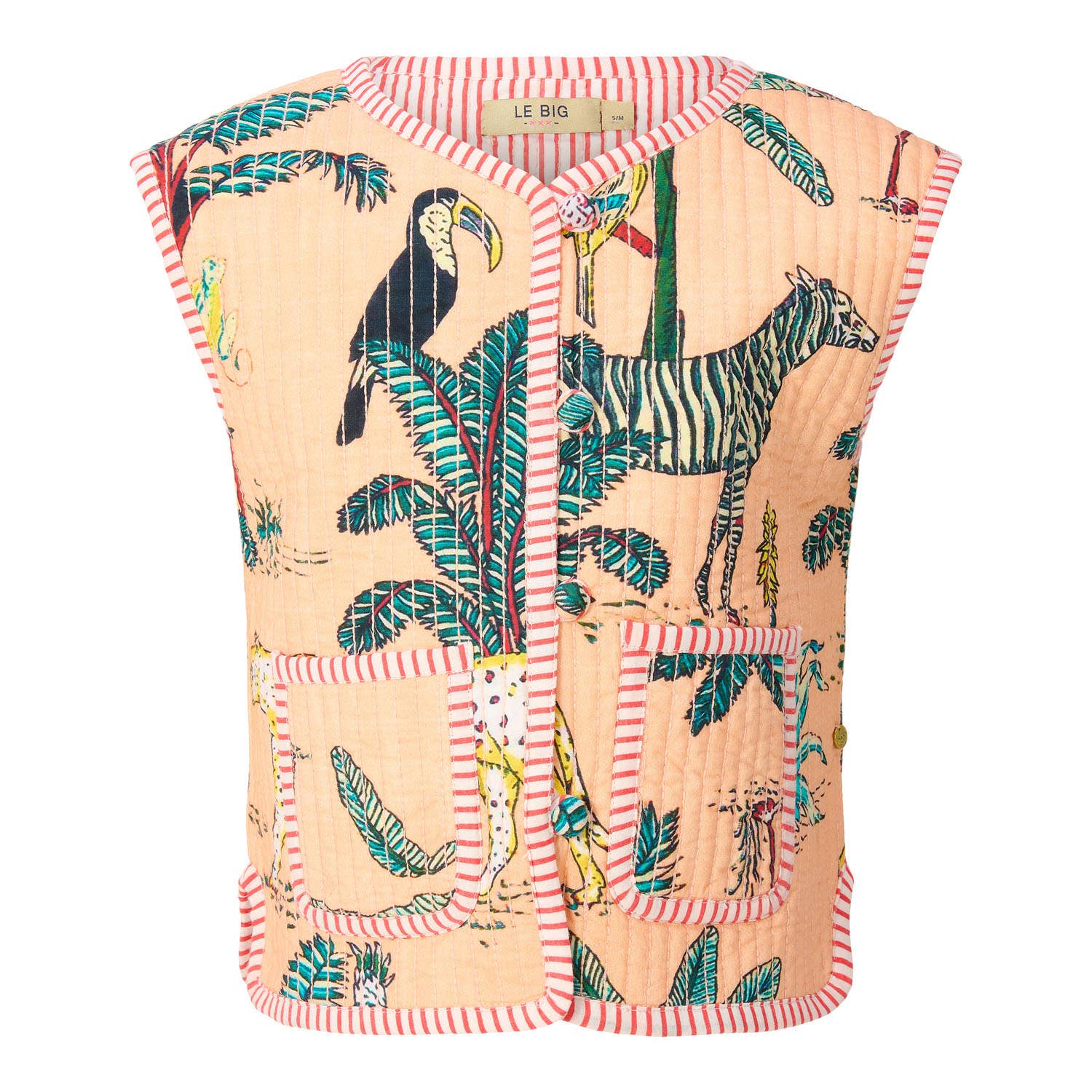 Chaleco acolchado de terciopelo de LE BIG. Este chaleco único añade color a tus conjuntos. Tiene dos estilos: un lado con terciopelo suave y estampado floral brillante, y el otro lado de algodón con una franja rosa neón. Se puede usar por ambos lados. INSTRUCCIONES DE LAVADO: lavar a máquina a 30 °C, no usar blanqueador, no secar en secadora, planchar a baja temperatura, no limpiar en seco. MATERIAL: 100% algodón AJUSTE: regular COLORES: rosa, dorado y beige