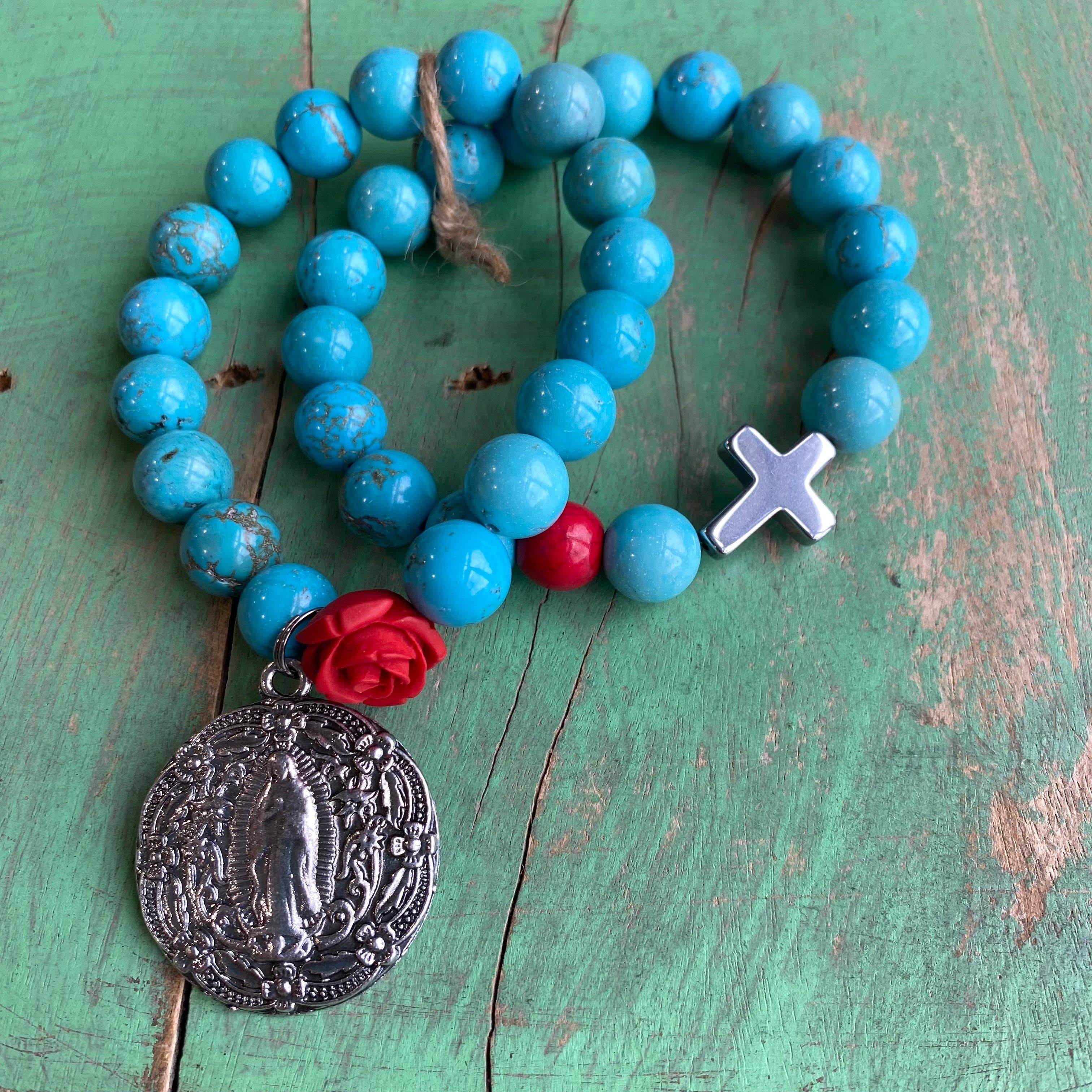 Hermosa pulsera de cuentas con acabado en oro cepillado y colgante del Corazón Sagrado. Disponible en blanco, azul, morado, turquesa y amarillo.