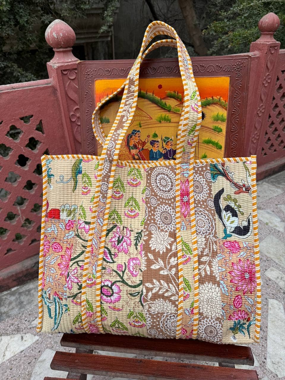 Hecho en India Color: Multicolor Decoración: Acolchado Estampado: Patchwork Tamaño del bolso: Grande Tejido: Algodón Peso: 300 g (10,58 oz)