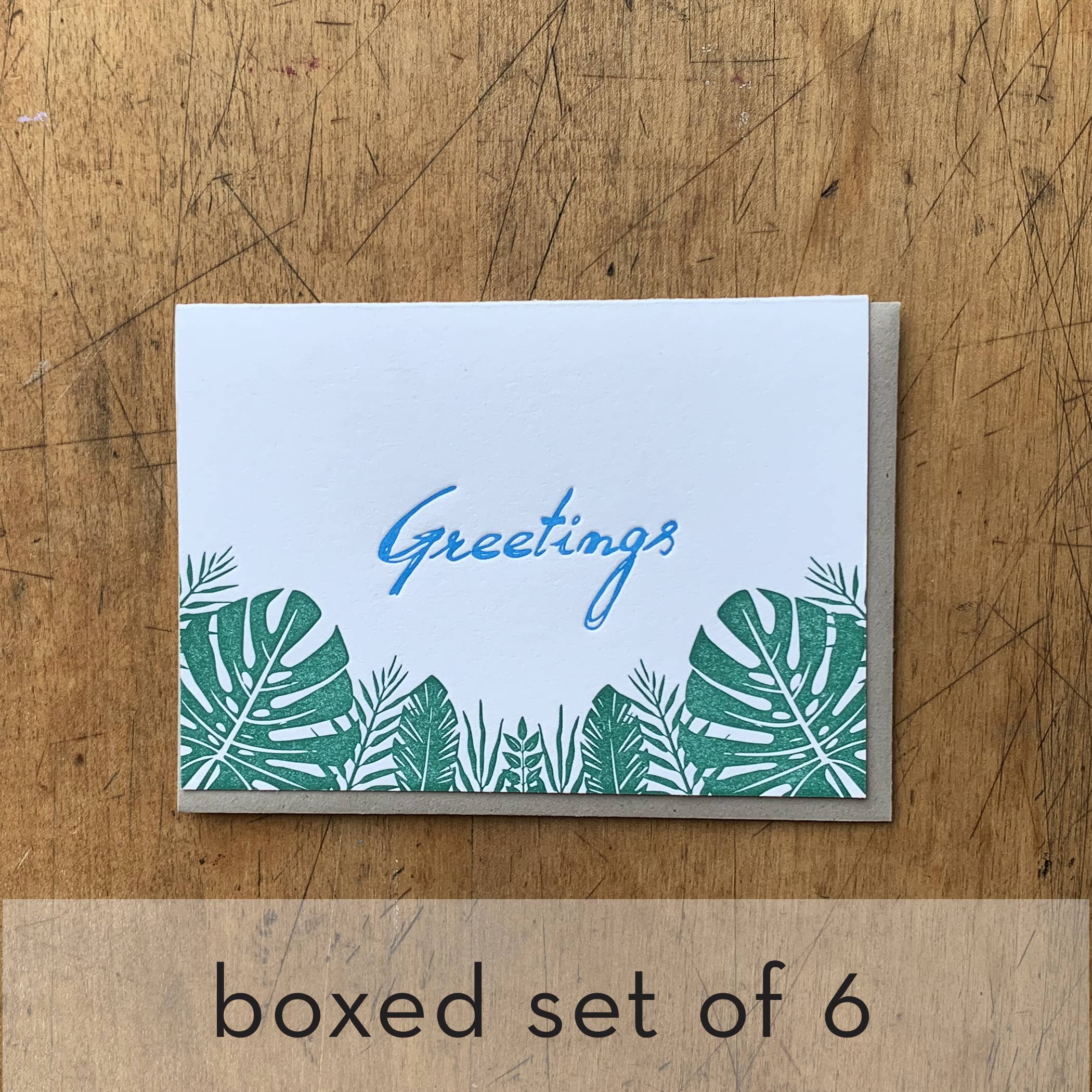 Tinta verde y plateada sobre papel blanco Canaletto Premium, emparejado con un brillante sobre de coral neón. Tamaño A2 (4.25" x 14 «) plegado, interior en blanco. Embalado como un juego de 6 en una caja rígida transparente. Impreso a mano en equipos antiguos de tipografía en Portland, Oregón. También disponible como una sola tarjeta.