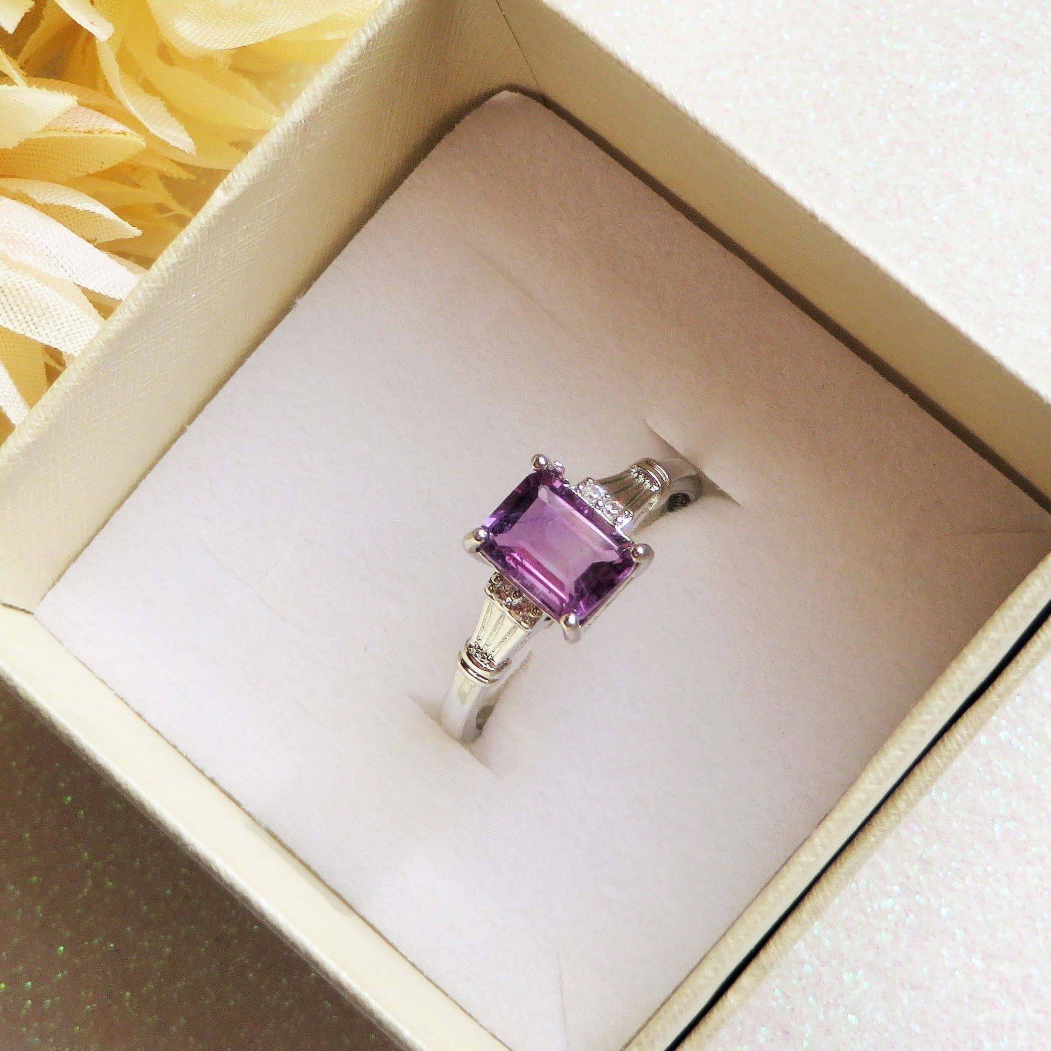 SHIVA ~ Anillo ajustable en Amatista corte rectangular natural con circonita cúbica