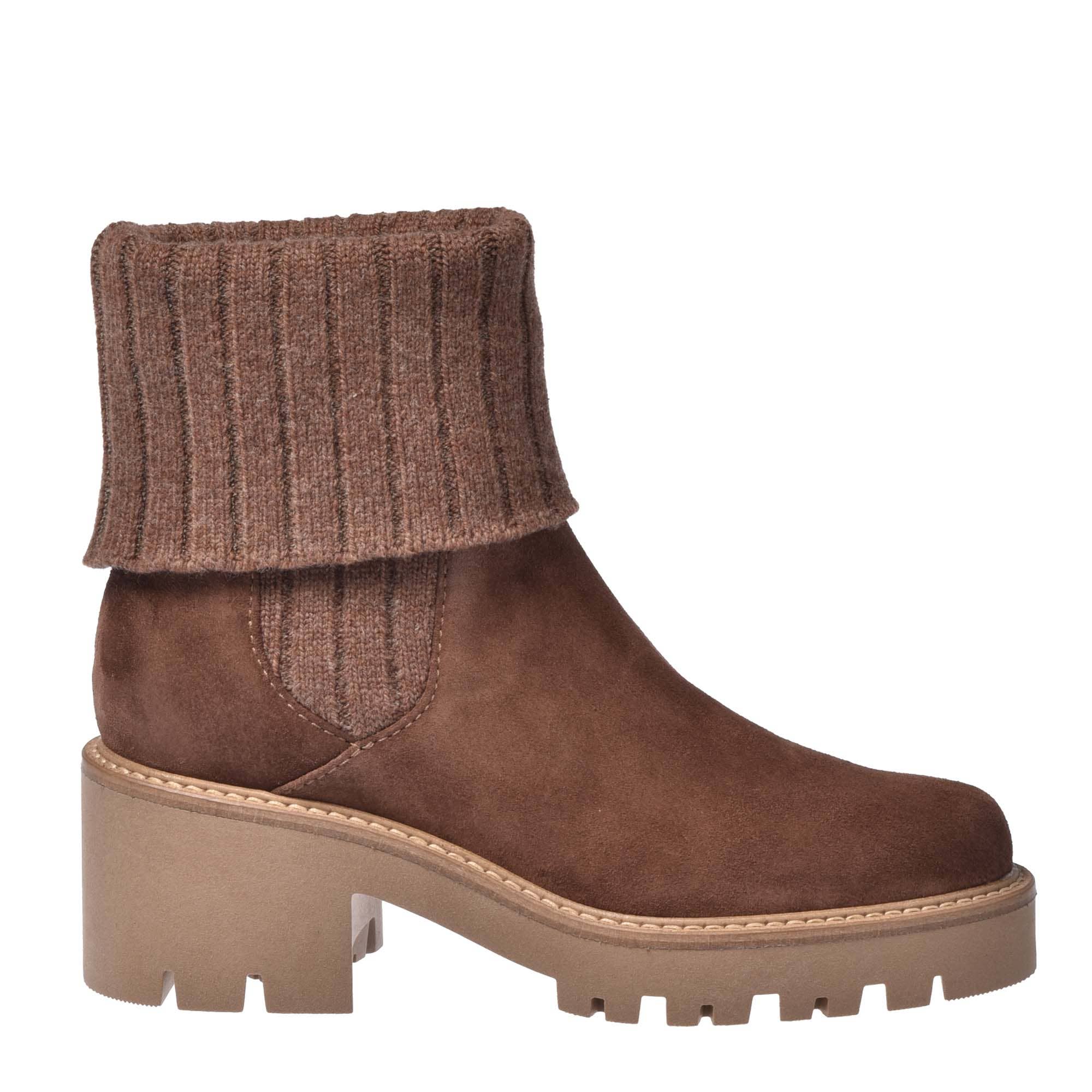 Bota de mujer con tachuelas en plata exterior de ante topo fabricada en Italia.