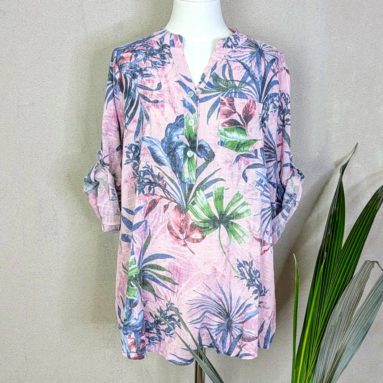 Top de talla única de mezcla de seda y viscosa con cuello en V y estampado artesanal de flores (M-L)