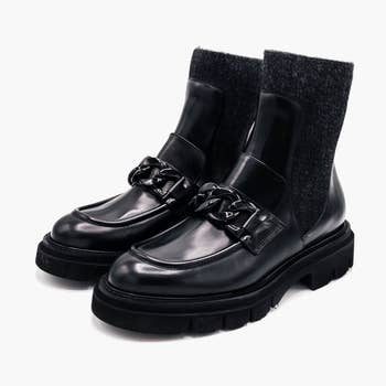 Botas negras de cuero con suela gruesa. Cada artículo de Eccellenza Donna está diseñado, modelado y decorado por especialistas, artesanos y zapateros dedicados que supervisan la fabricación para asegurar calidad y comodidad. El cuero y otros materiales son seleccionados por expertos que trabajan cada pieza a mano, haciendo que cada par sea único.