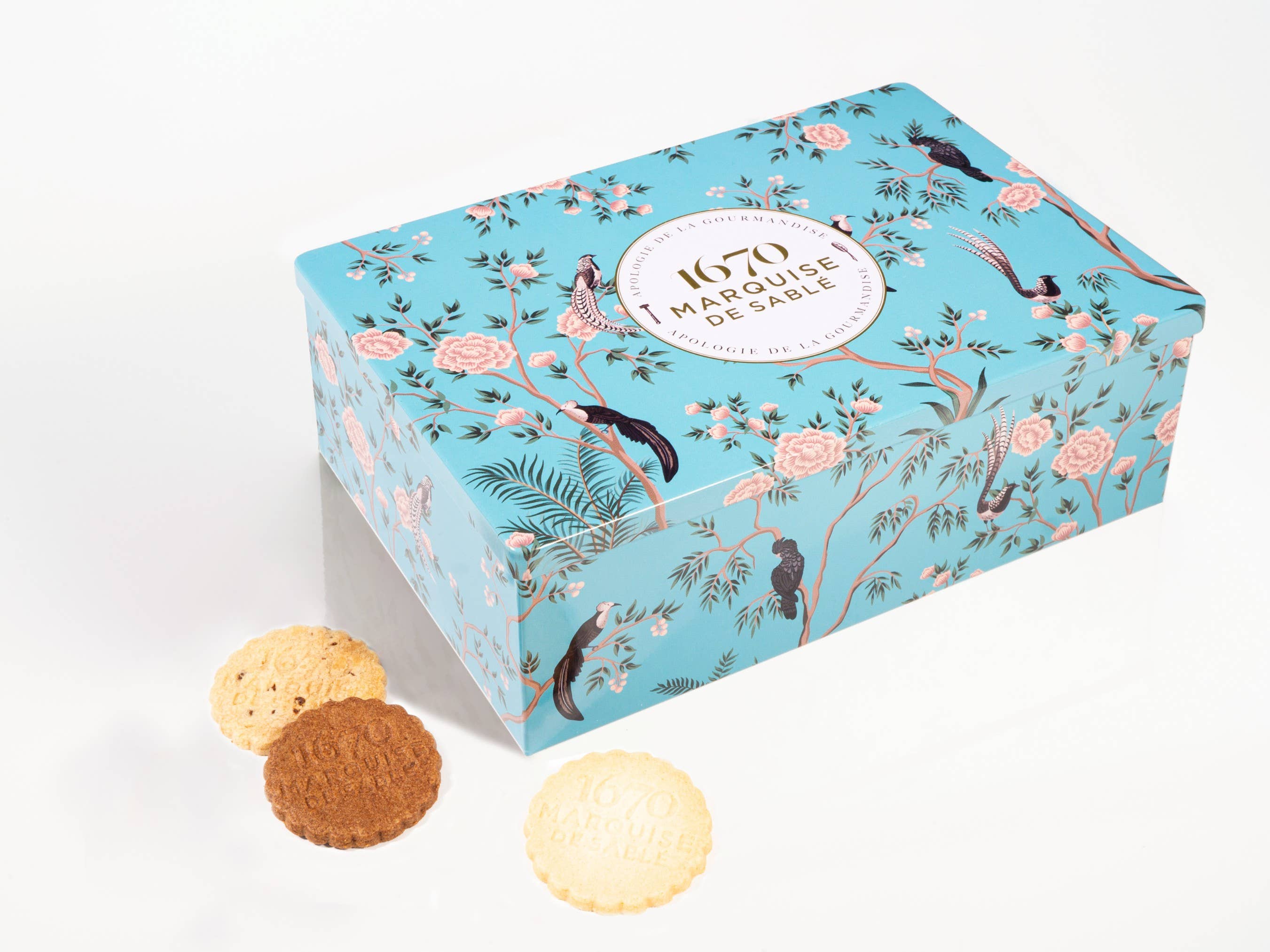 Apreciará esta caja con la imagen de un lindo gato blanco. Con la elegancia y sobriedad necesarias, esta caja metálica es el regalo ideal para los amantes de los gatos y los gourmets que disfrutan de deliciosas galletas sablé con chispas de chocolate.