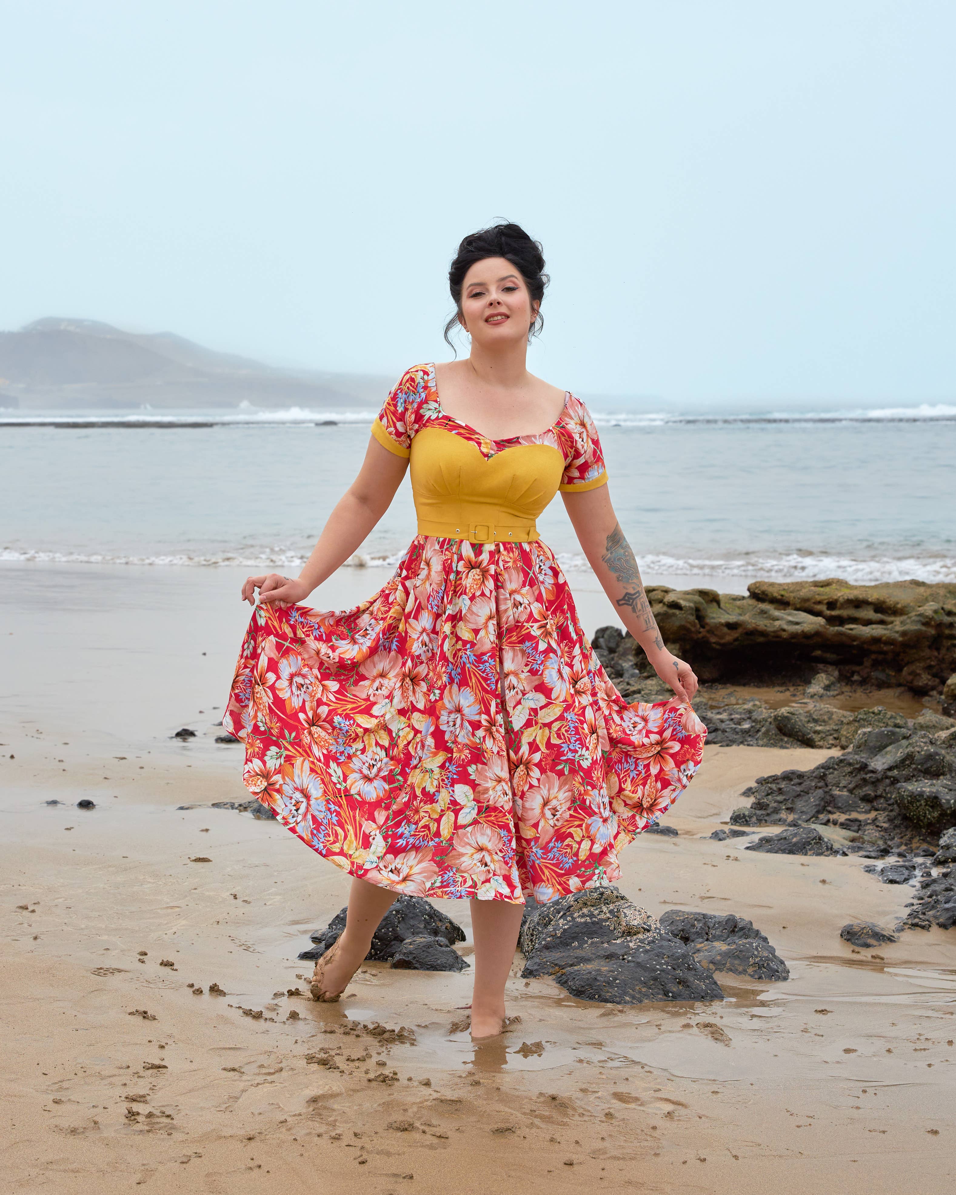 Un vestido elegante y cómodo para el día a día con un corte femenino y acampanado. Un modelo midi con un escote rectangular y tirantes ajustables que permiten una longitud perfecta y ofrecen comodidad. La cintura entallada resalta la silueta de manera hermosa, y las copas reforzadas integradas proporcionan soporte adicional para el busto, permitiendo que el vestido se pueda usar sin sujetador. En la parte trasera hay fruncidos que no solo añaden encanto al vestido, sino que también aumentan la elasticidad y la comodidad. La botonadura a lo largo del frente le da un carácter juvenil y facilita el vestir.