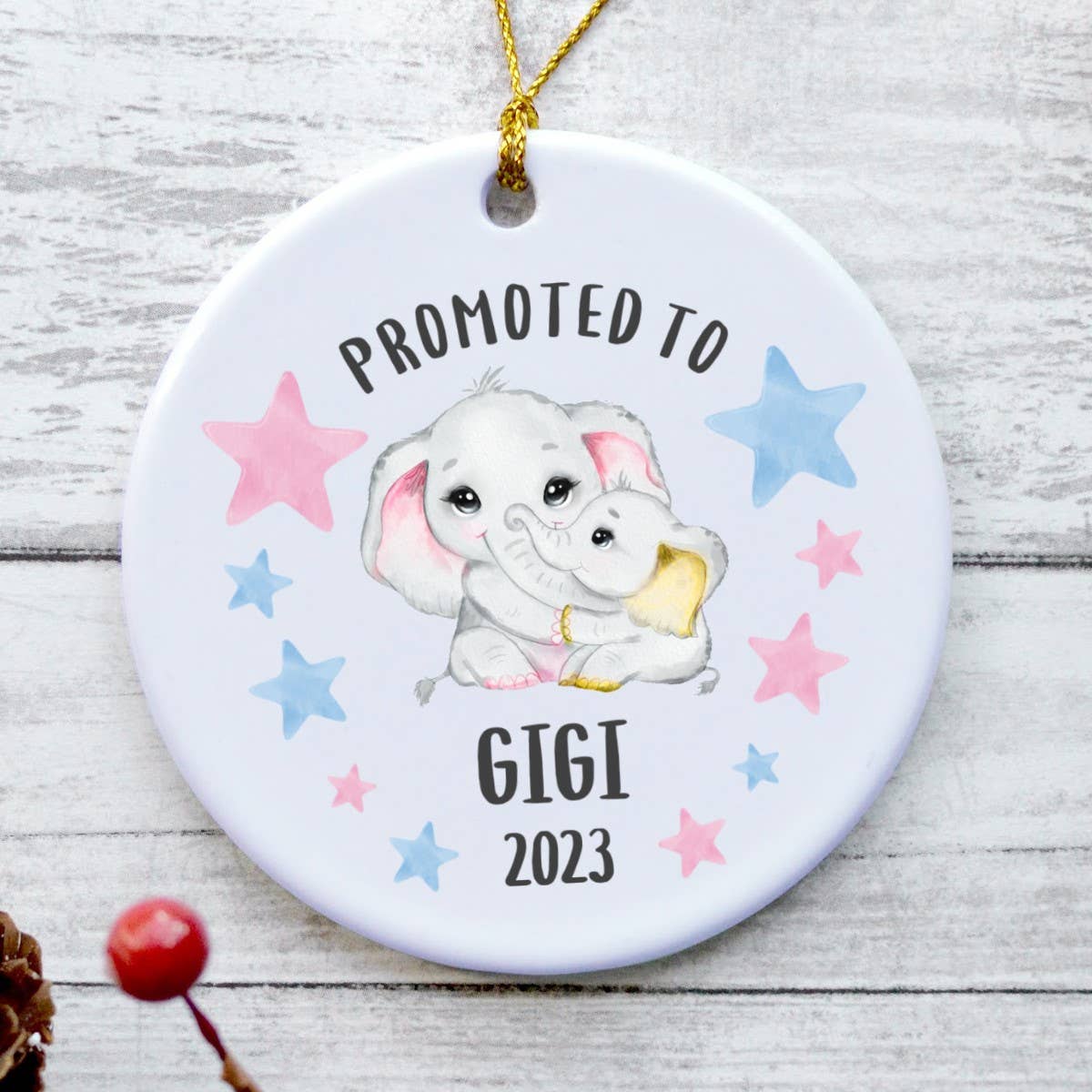 Le encantará este increíble adorno de alta calidad esperando ser ascendido a bisabuela 2023. ¡Regalos perfectos para la Gran Abuela 2023 para Navidad, cumpleaños, Día de San Valentín, Día de la Madre o como anuncio o revelación de embarazo de la bisabuela! Estos bonitos adornos navideños de elefantes son un regalo único y único en su clase que cualquier abuela seguramente apreciará. La cita completa dice: «ASCENDIDO A BISABUELA 2023» DETALLES DEL PRODUCTO ► Adorno de cerámica de forma redonda de 3". ► Diseño de 1 cara. ► Acabado brillante para una reproducción de imágenes vibrantes. ► Cuerda dorada para colgar. ► Impreso y enviado desde EE. UU.