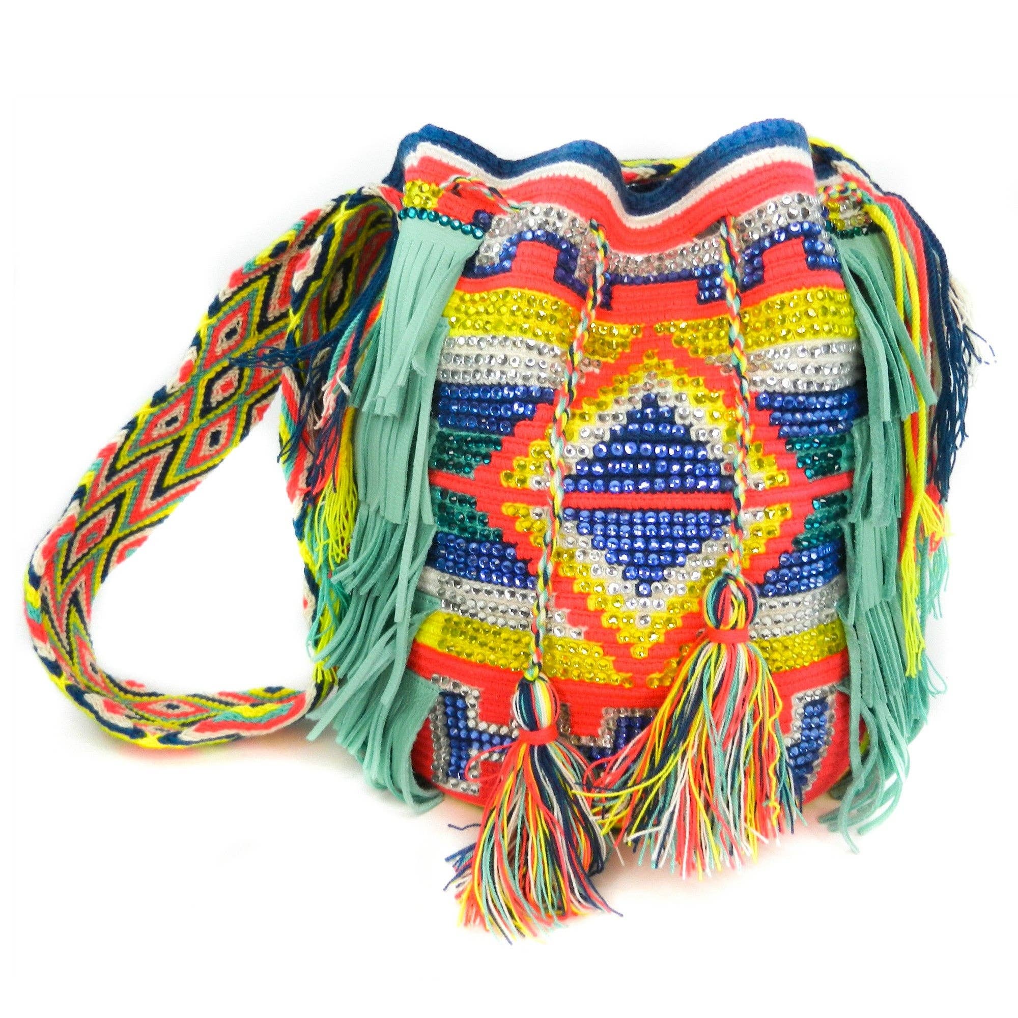 Mochilas de lujo por LUXCHILAS ClutchChila con flecos y correa Bolso clutch de lujo Wayuu Este hermoso bolso estilo clutch está tejido a mano durante más de 120 horas por mujeres de la tribu Wayuu y adornado en el frente con cristales y flecos de cuero. * Totalmente forrado * Cremallera * Correa trenzada de cuero desmontable * 100% hilo acrílico, cristales de vidrio y cuero auténtico * Talla: Mediano * Hecho a mano en Colombia 🇨🇴 * Pieza única * Comercio justo * Parte de los ingresos se dona para alimentar a los niños de la tribu
