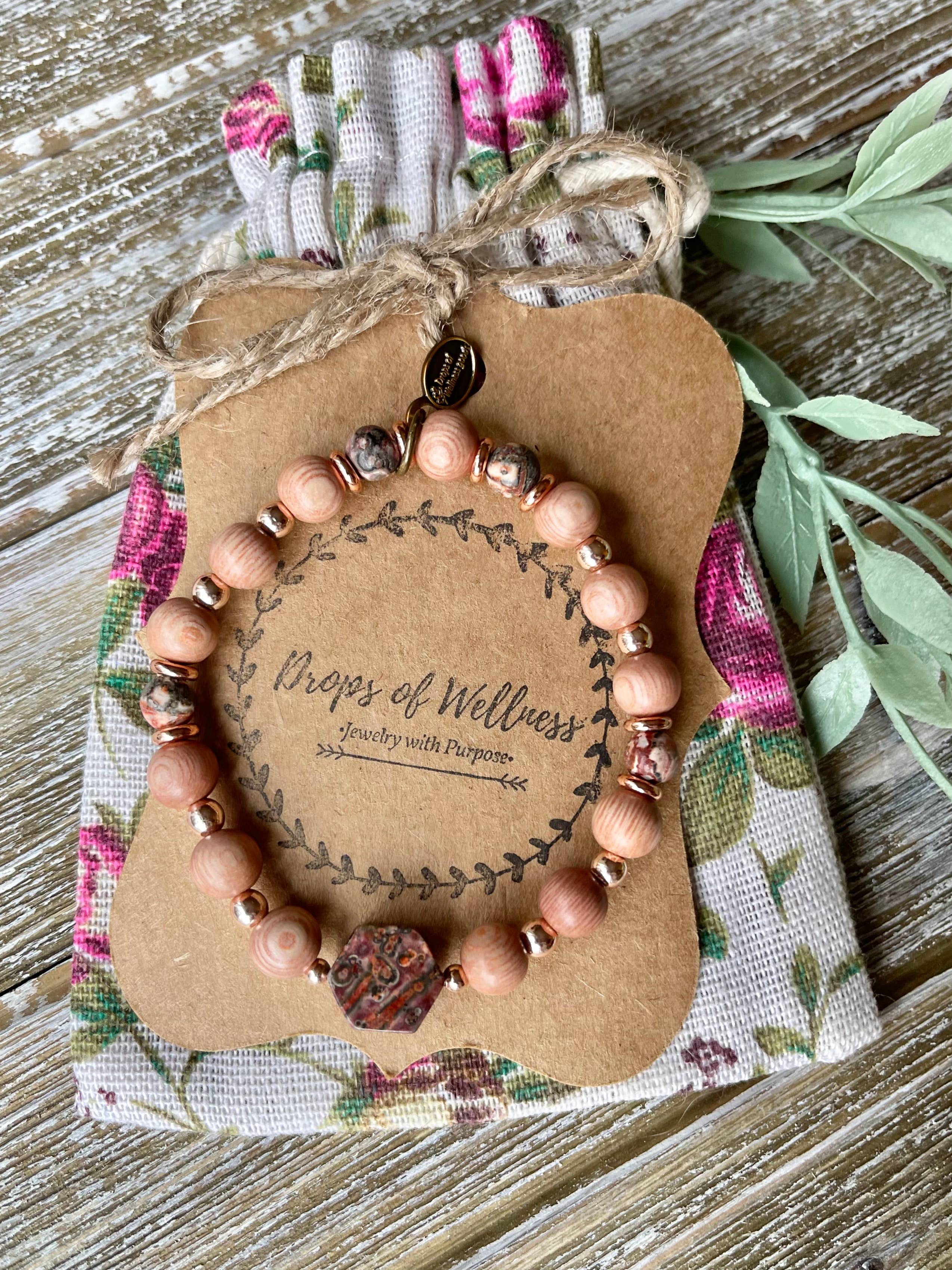El Cherry Blossom está diseñado con rodonita natural de flor haitiana y piedra fósil blanca junto con cuentas difusoras de palisandro en bruto. Las piedras tienen un tamaño de 8 mm y se pueden apilar con otros diseños o usar solas. Cada diseño está hecho con un cordón elástico de 1 mm que da resistencia y permite el estiramiento. Simplemente añade 1 o 2 gotas de aceite esencial a las perlas difusoras de palo de rosa crudo para disfrutar de los beneficios aromáticos durante todo el día. Vuelva a aplicar según sea necesario. Cada diseño está etiquetado individualmente para permitir al minorista fijar el precio.