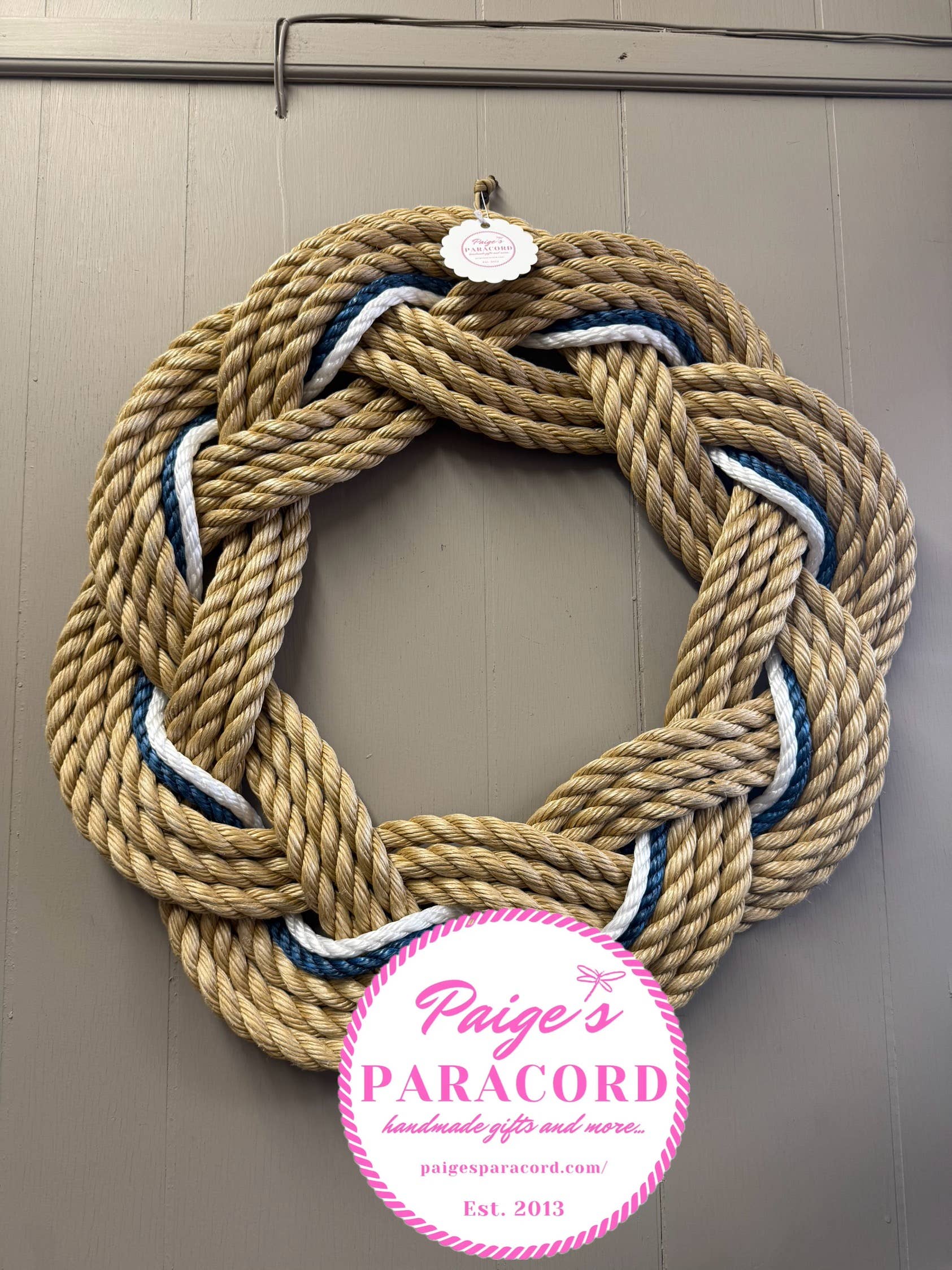 Estas coronas están hechas de cuerda de 3/8 de pulgada y cuentan con un anillo en la parte trasera para mantener su forma. Se incluye un trozo de paracord de aproximadamente 1 pie de longitud para colgarlas.
