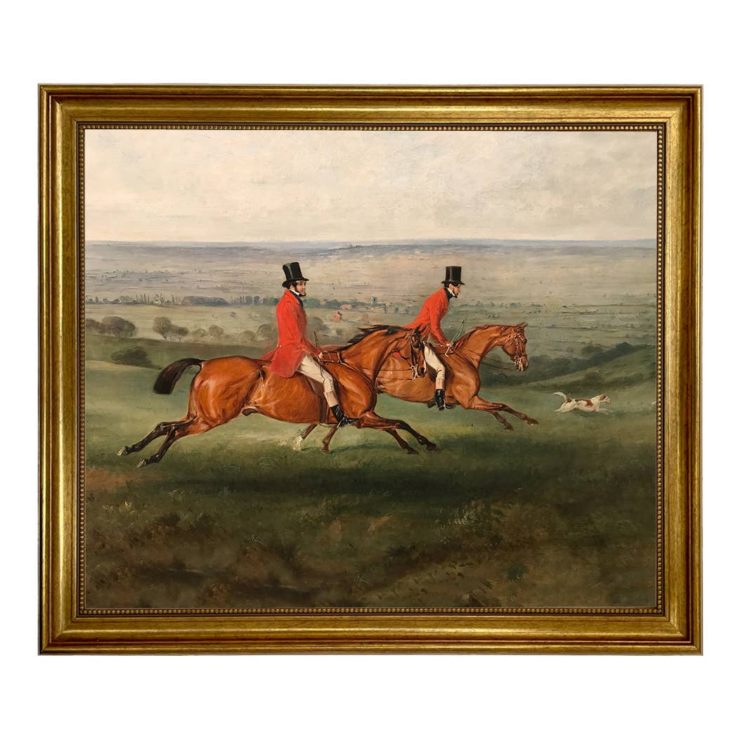 Este estampado panorámico de una escena de caza de zorros ingleses está impreso sobre lienzo, montado en una tabla y tratado con un barniz de aspecto histórico. Enmarcado en un elegante marco de resina dorada de 1-1/8 pulgadas de grosor, la parte trasera está acabada con papel artesanal 100% reciclado y una percha de alambre. Decoración perfecta para el campo ecuestre o inglés, y una gran adición a la pared de una galería. • Tamaño del marco: 17-3/4 pulgadas x 7-3/4 pulgadas • Profundidad del marco: 1 pulgada
