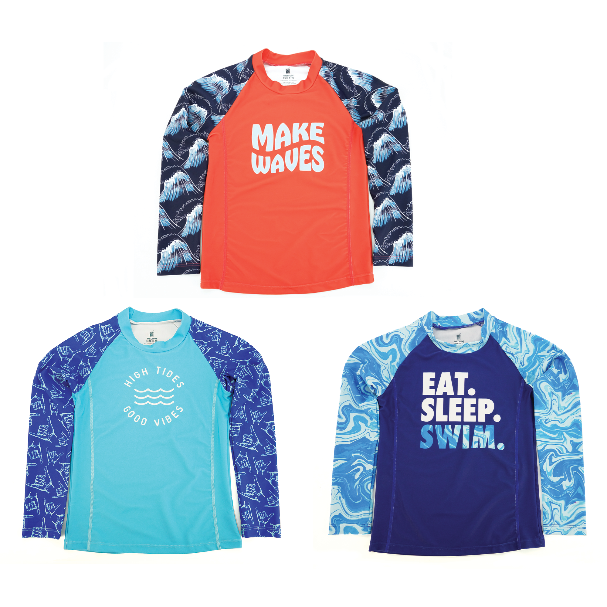 Brillantes, coloridas camisas de baño para niños! Infundido con protección UV50+, estas camisetas de natación ajustadas son ideales para limitar la exposición solar y mantener fuera el frío en parques acuáticos, salpicaduras, clases de natación, deportes y días soleados en la playa. -Protección solar UV50+ -Diseño de ajuste delgado. -Mangas largas para una máxima cobertura -Tres tamaños basados en la edad: S (6-7), M (8-10), L (12-14) -Reordenar por estilo y tamaño en 2 paquetes. Empaquetado en bolsa transparente con cremallera.