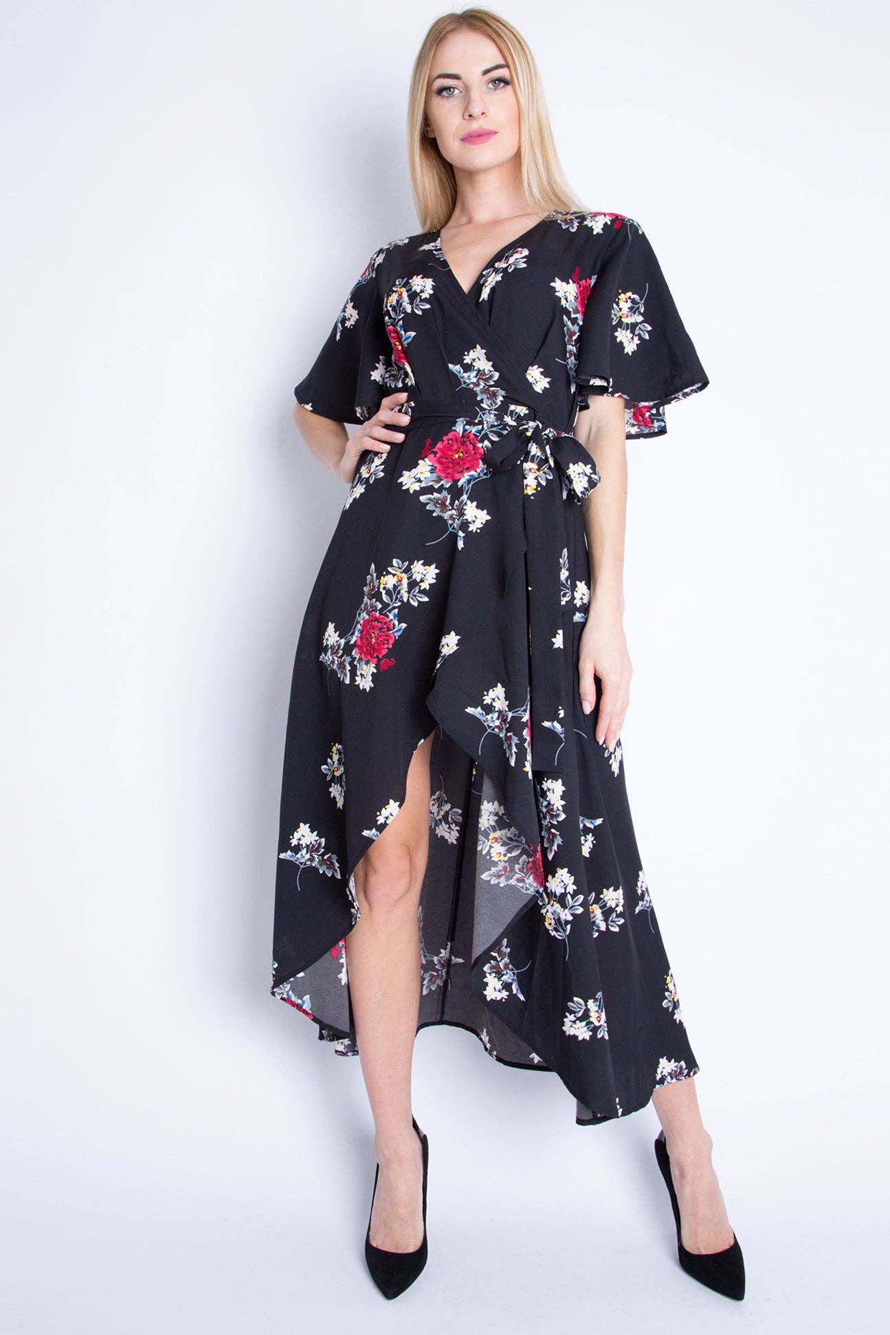 SKU: C6906BLACK Hecho en China Color: Multicolor y Negro Cuello: Redondo amplio Estampado: Floral Estilo de vestido: Ajustado en la parte de arriba y suelto en la parte de abajo Estilo: Minimalista Largo de faldas y vestidos: Midi Longitud de manga: Manga corta Ocasión: Formal y Noche de fiesta Tejido: Poliéster 100% Tema por ocasión: Boda, Espíritu de equipo, y Para todos los días Temporada: Primavera-verano