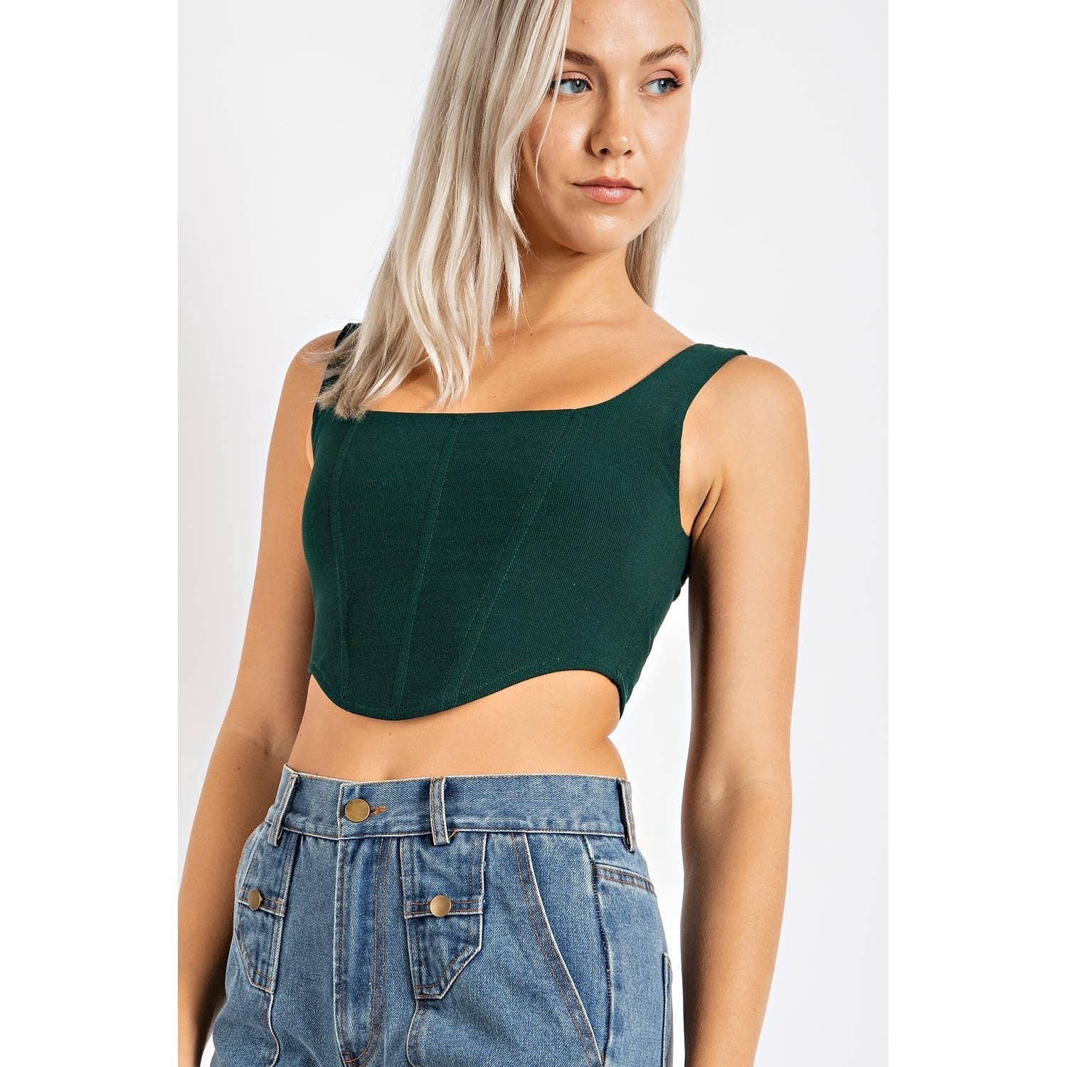 Descubre un look elegante y con estilo con la blusa corta tipo corsé de punto liso CT2028, que presenta una cómoda mezcla de 62% rayón, 33% nailon y 5% elastano para un ajuste perfecto