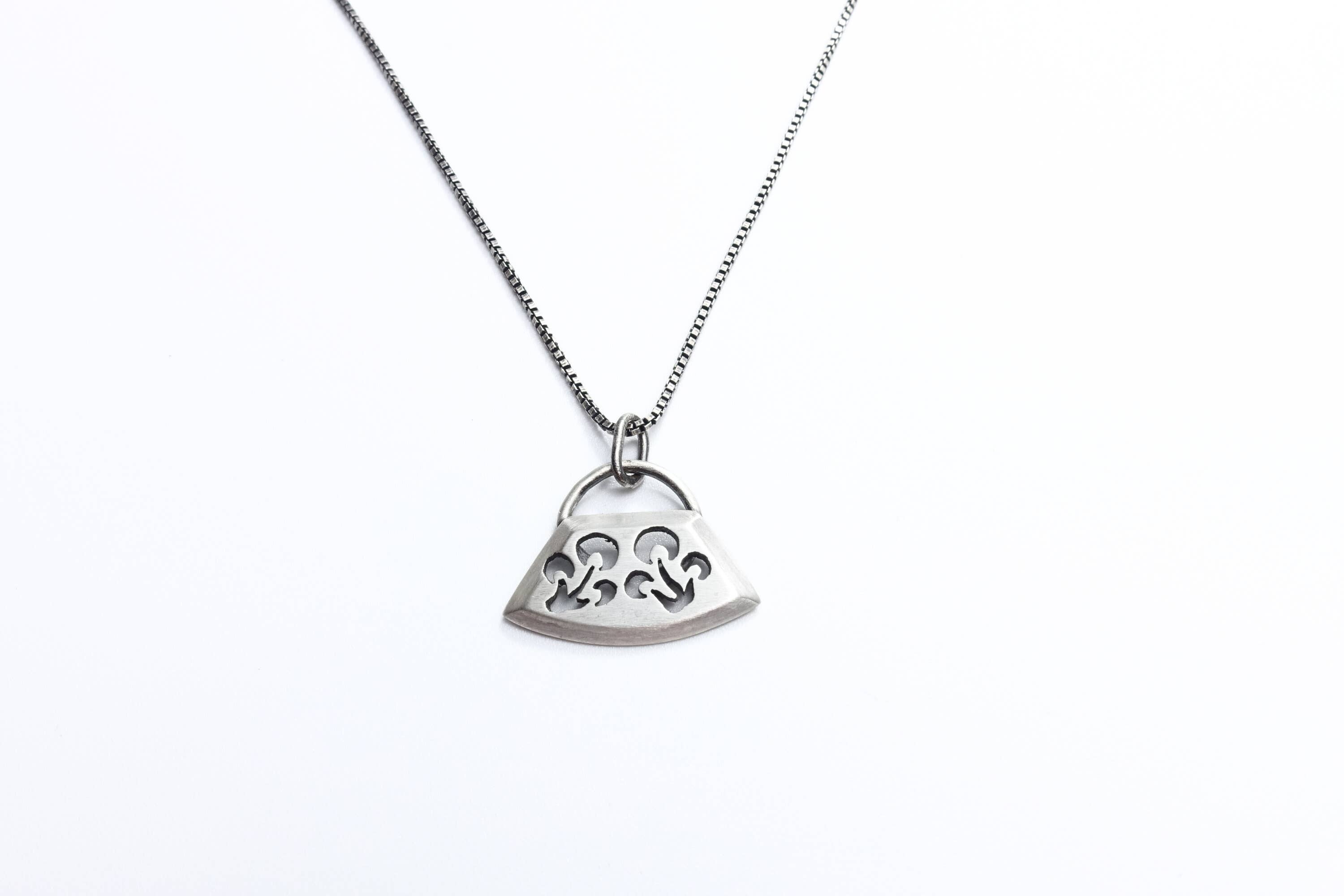 Setas de sombrero dorado (sí, esas son las mágicas) cortadas a mano en plata de ley resistente al deslustre. No uso láseres, solo una sierra de marco en C con hojas muy pequeñas. Viene en una cadena de plata de ley con un cierre hecho a mano, ajustable de 16" a 19". El colgante mide 1 1/8" x 1/2".